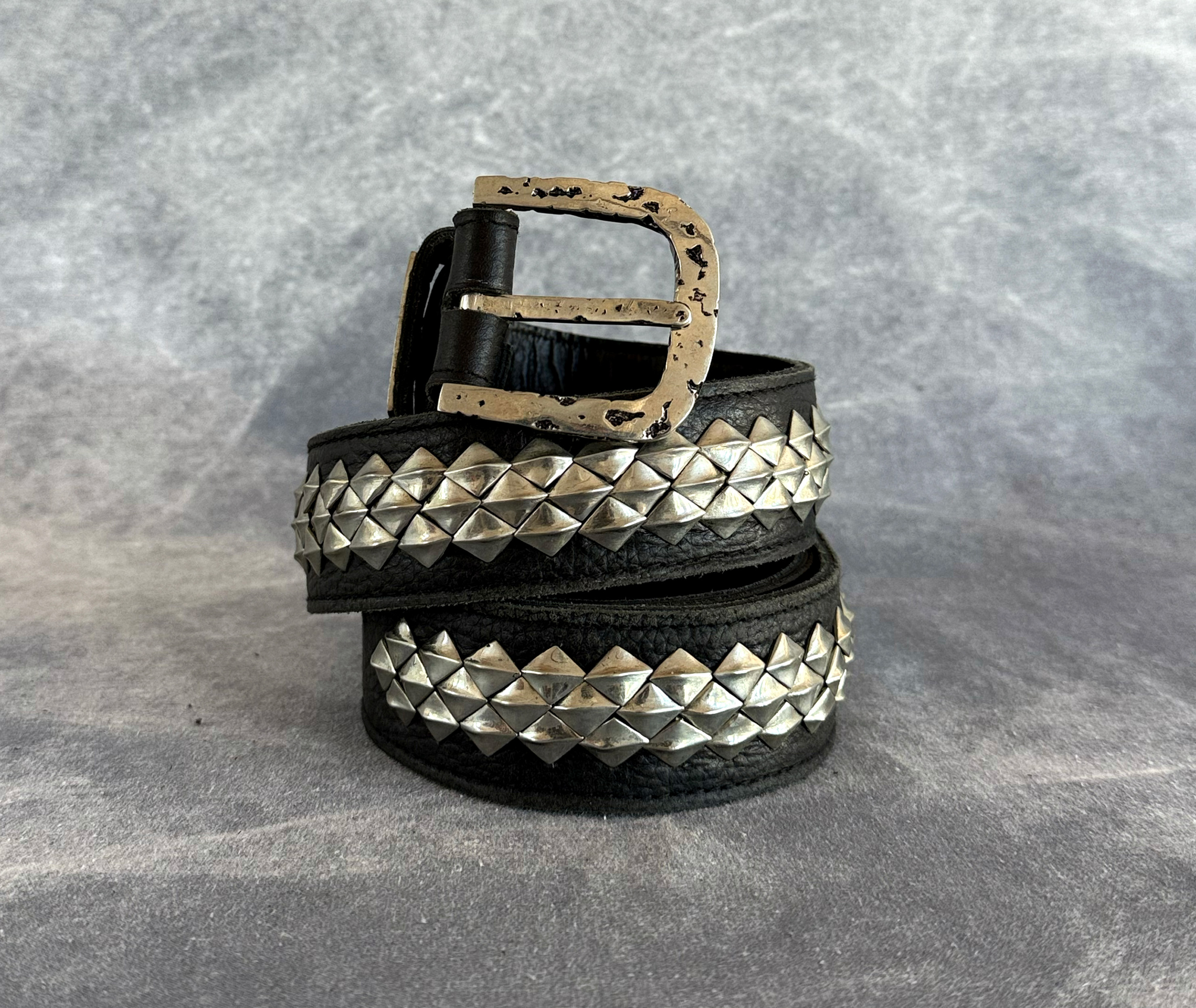 Handmade belt made from two layers of cow leather featuring custom hardware.