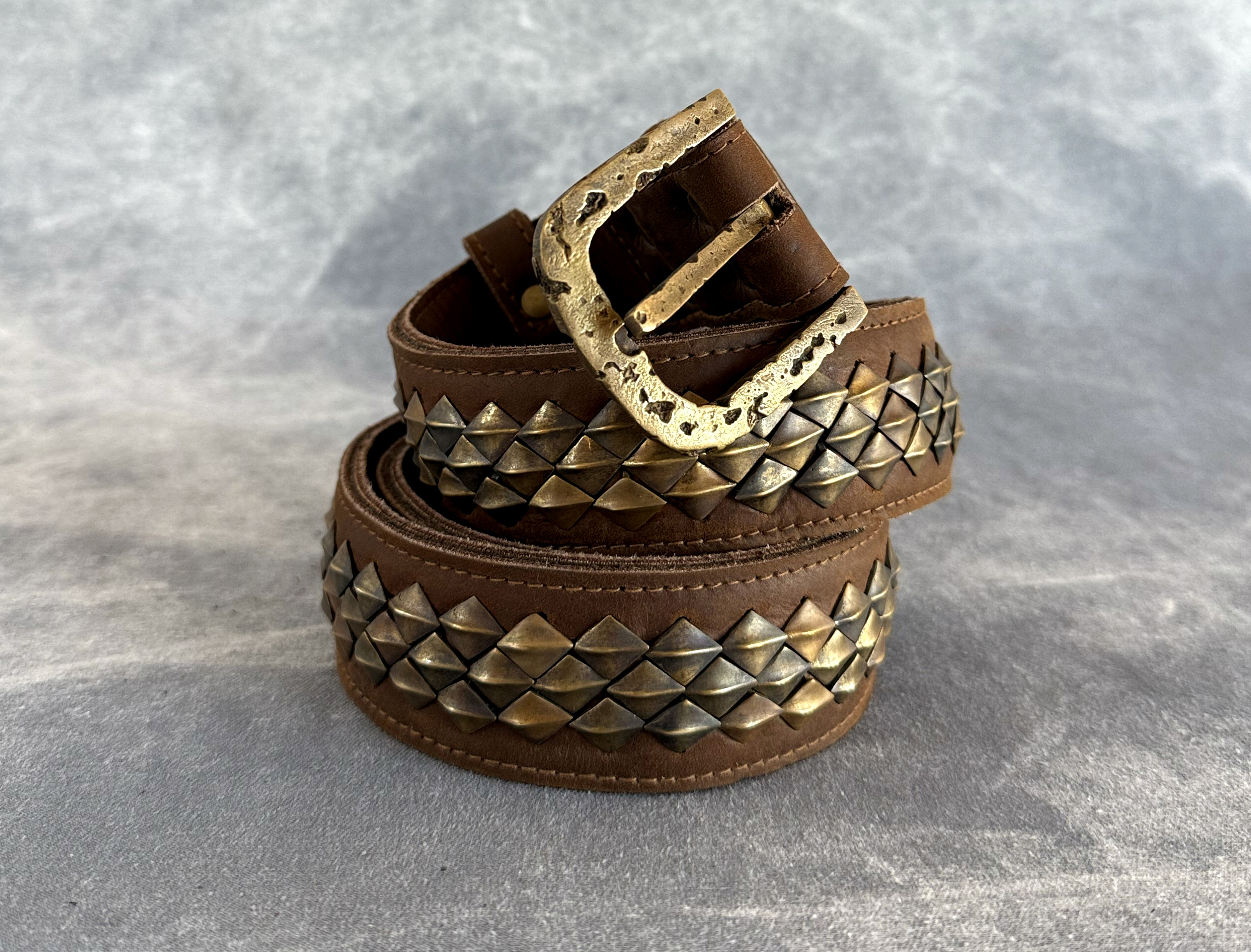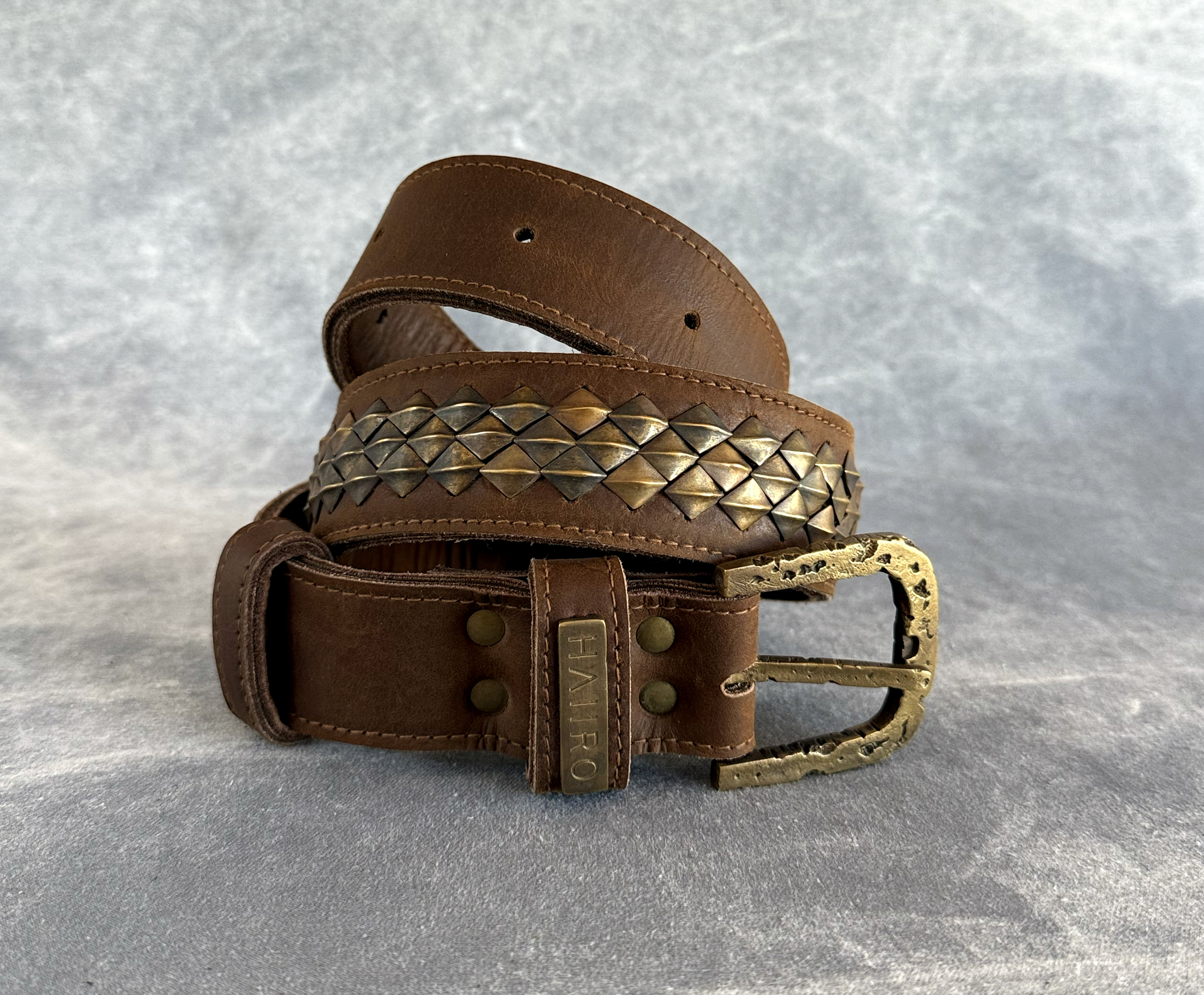 Handmade belt made from two layers of cow leather featuring custom hardware.