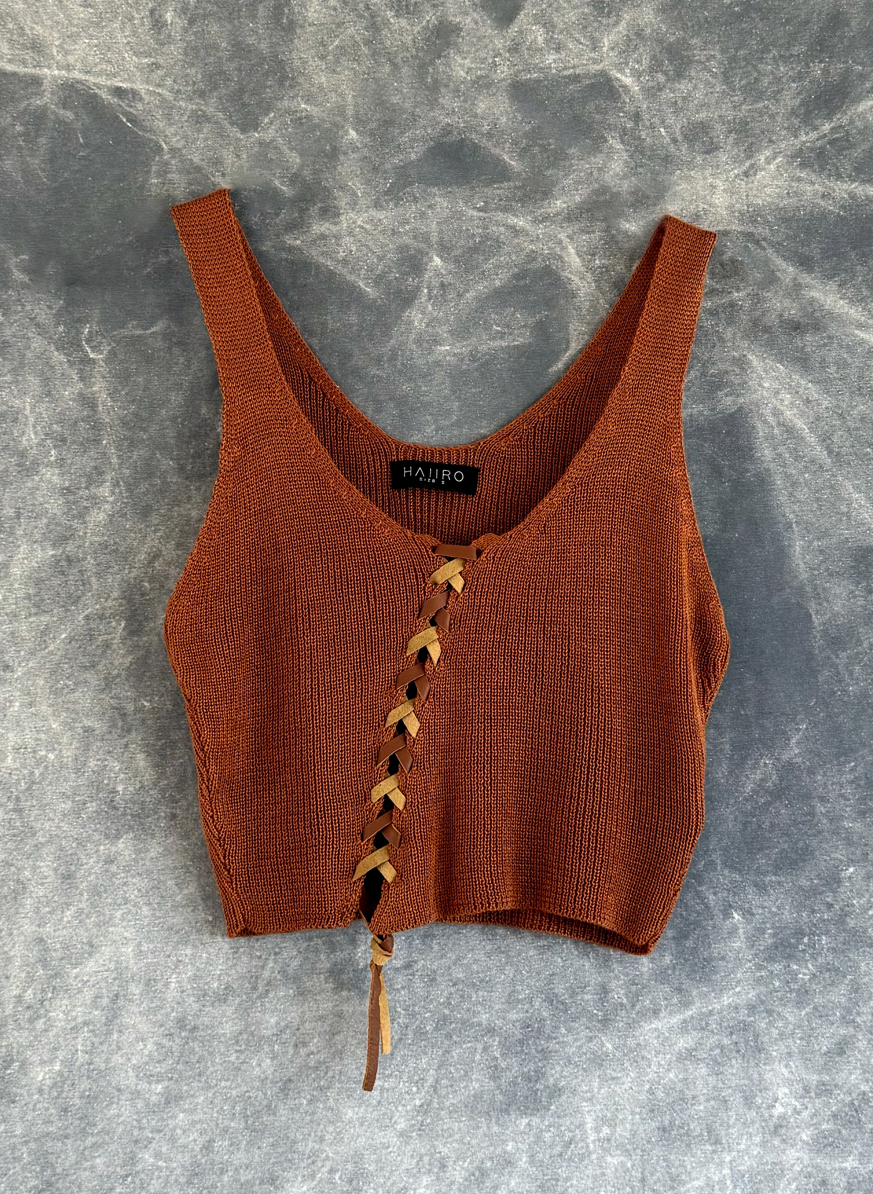 Handmade knit top made from a very soft cotton featuring a detailed leather design made from sheep skin.