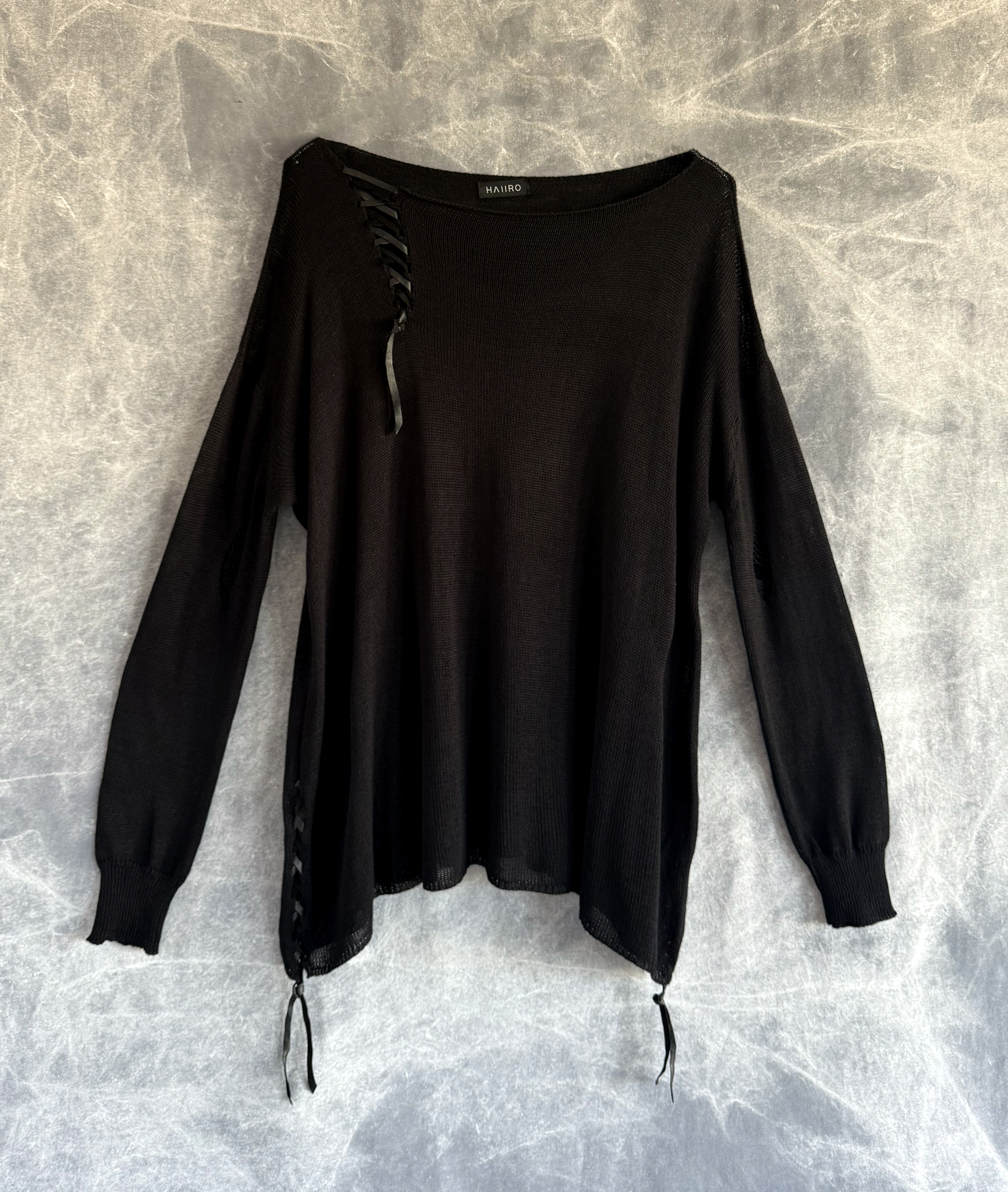 Handmade knit sweater made from a very soft cotton featuring a detailed leather design made from sheep skin.