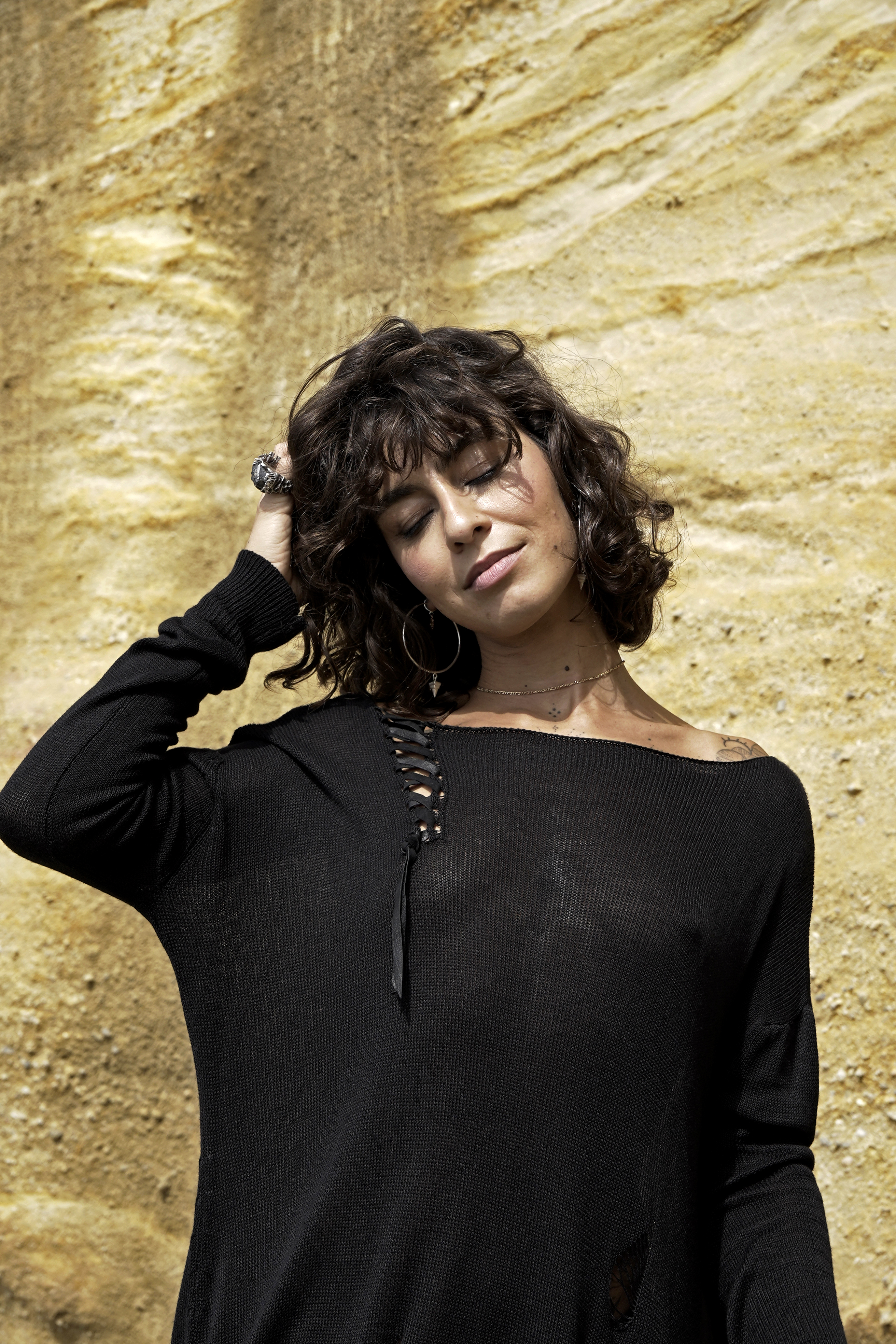 Handmade knit sweater made from a very soft cotton featuring a detailed leather design made from sheep skin.