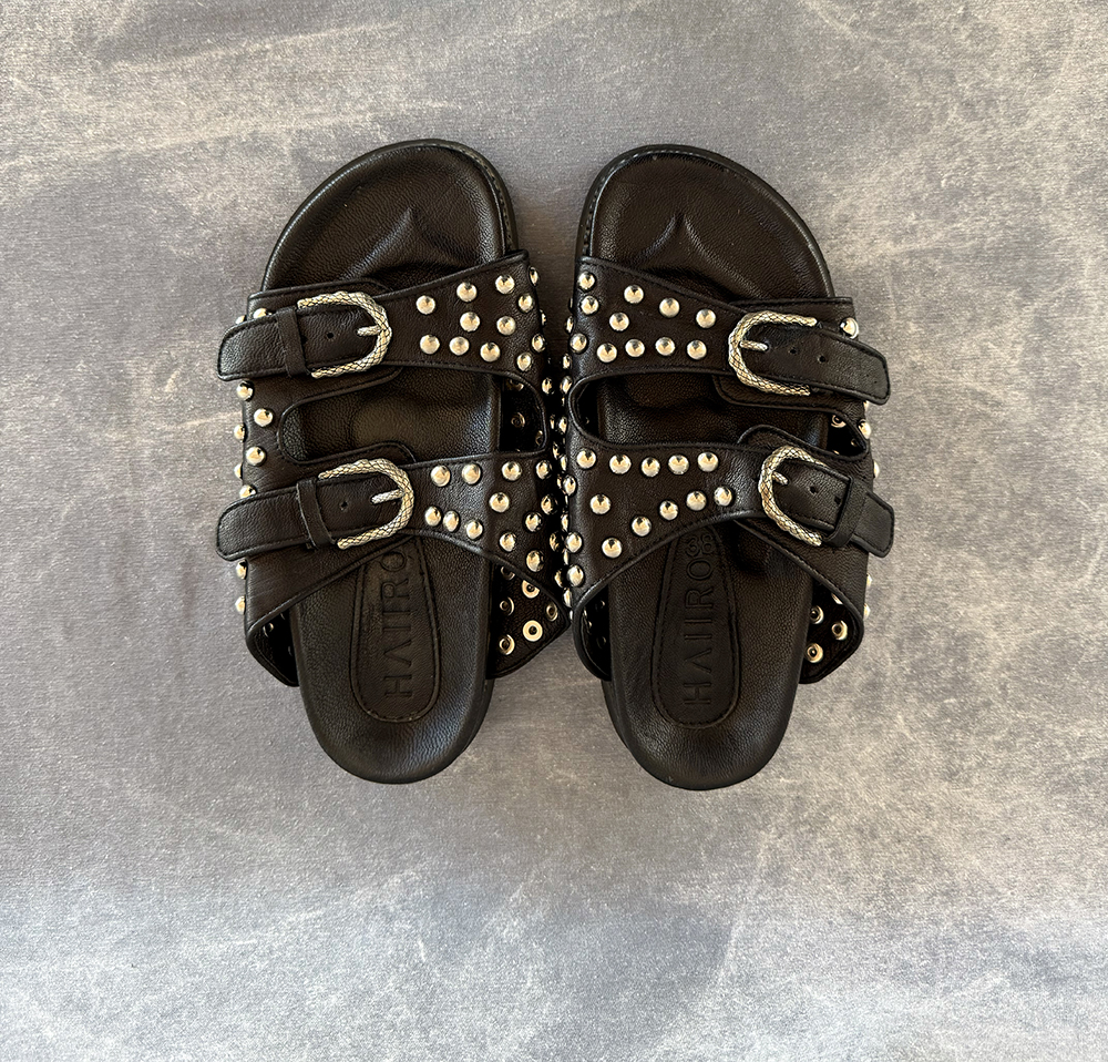 Handmade sandals made from a very soft goat leather with custom buckles and studs.