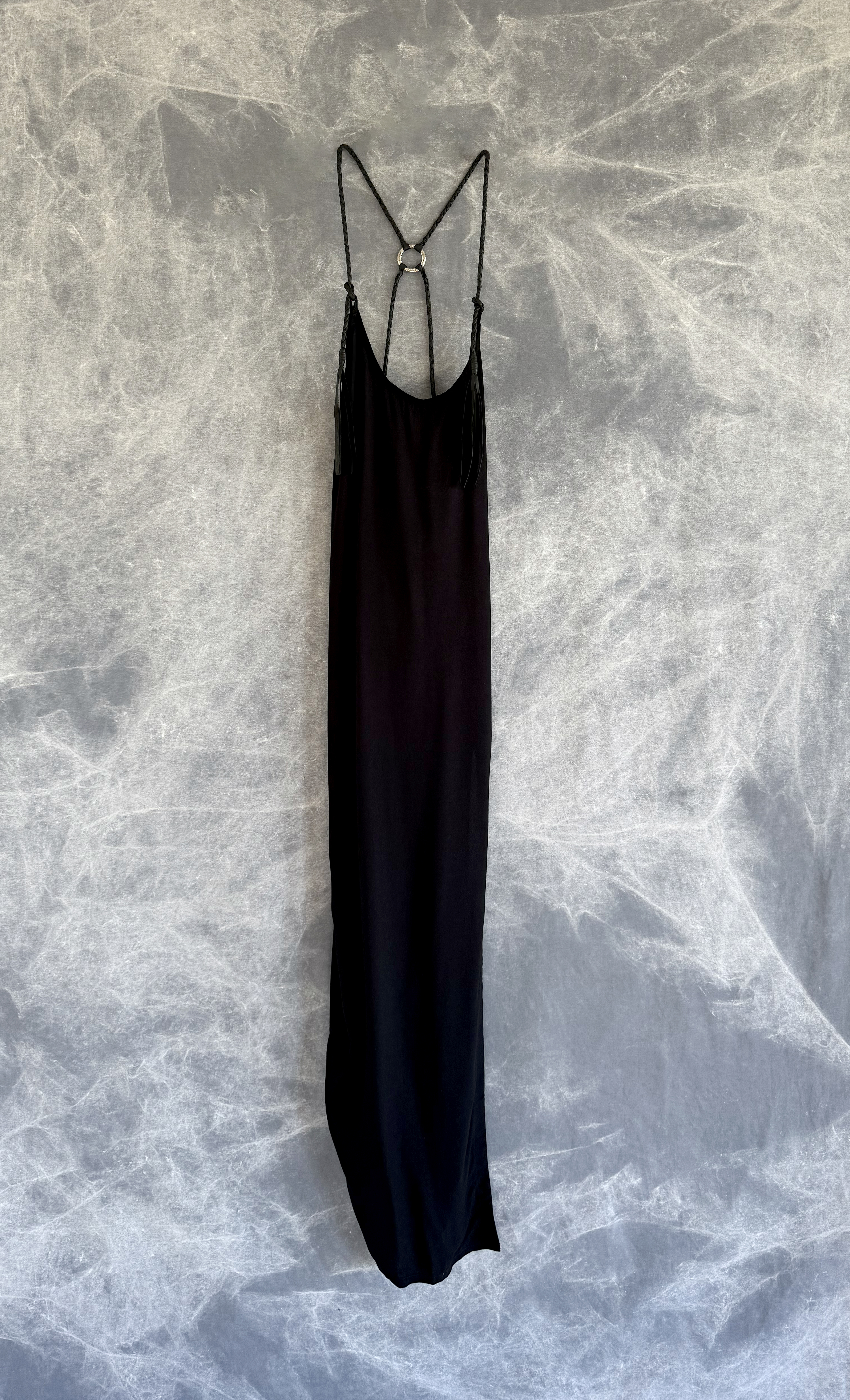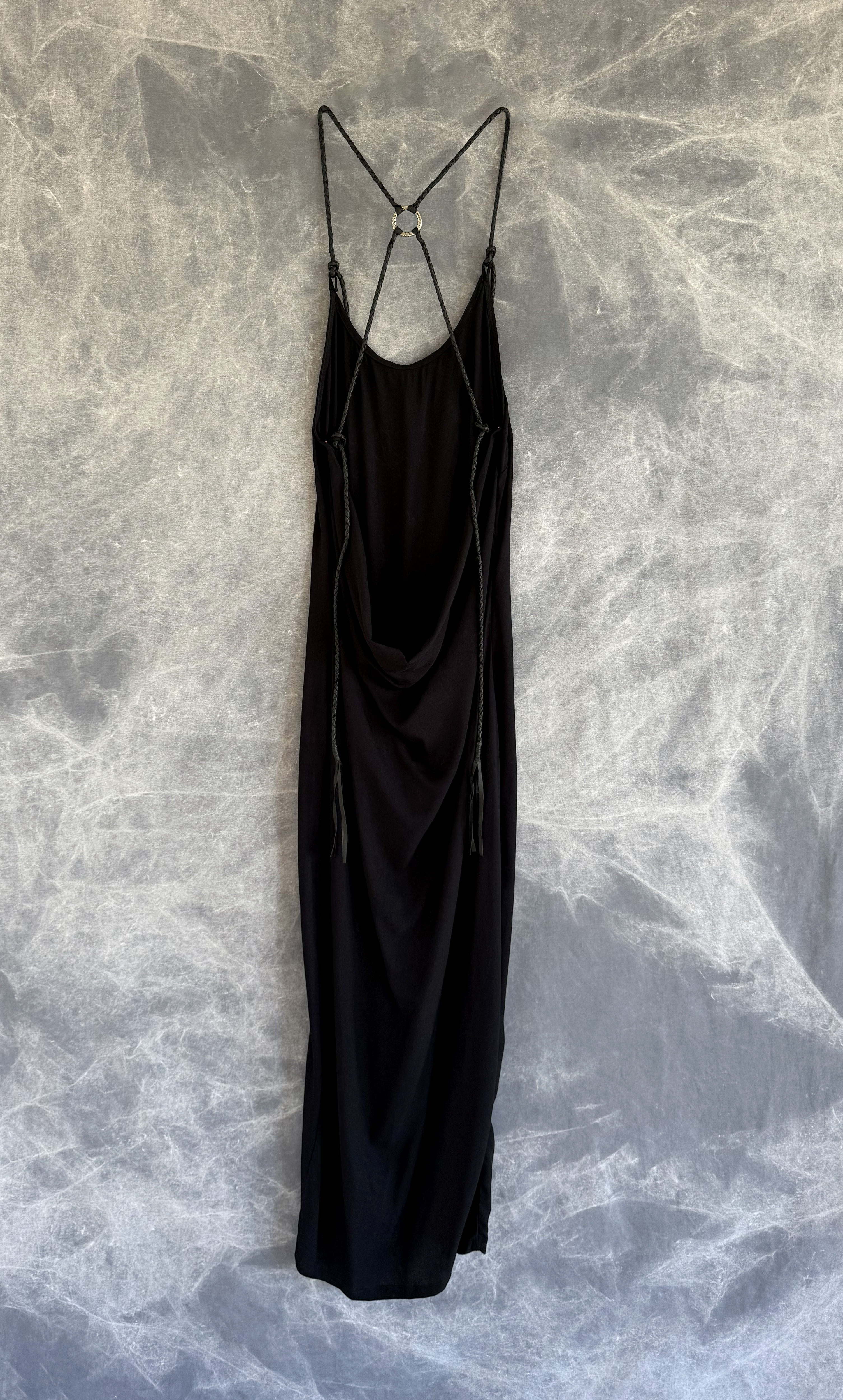 Handmade dress made from a very soft bamboo featuring an open back with adjustable leather strings and a custom brass ring.