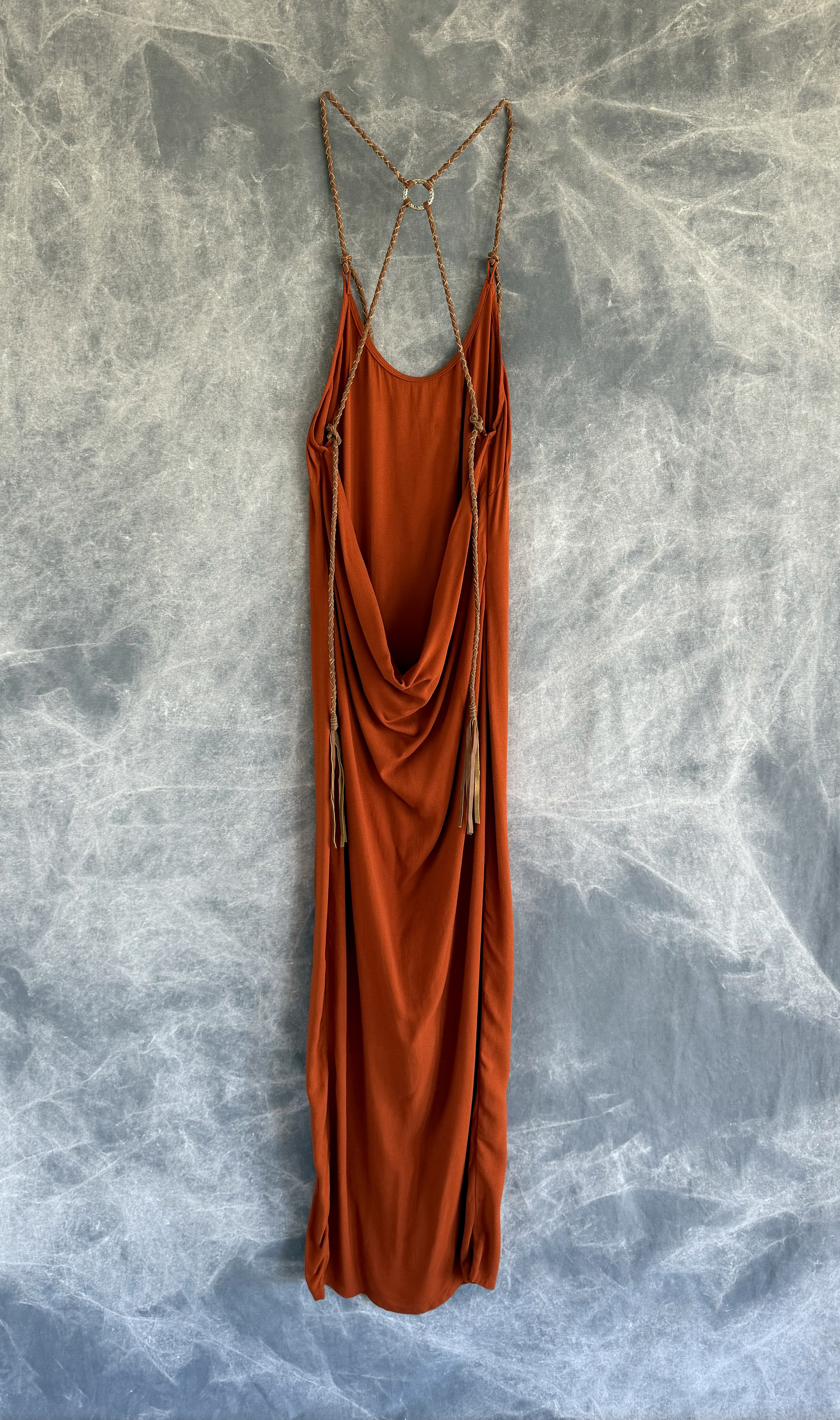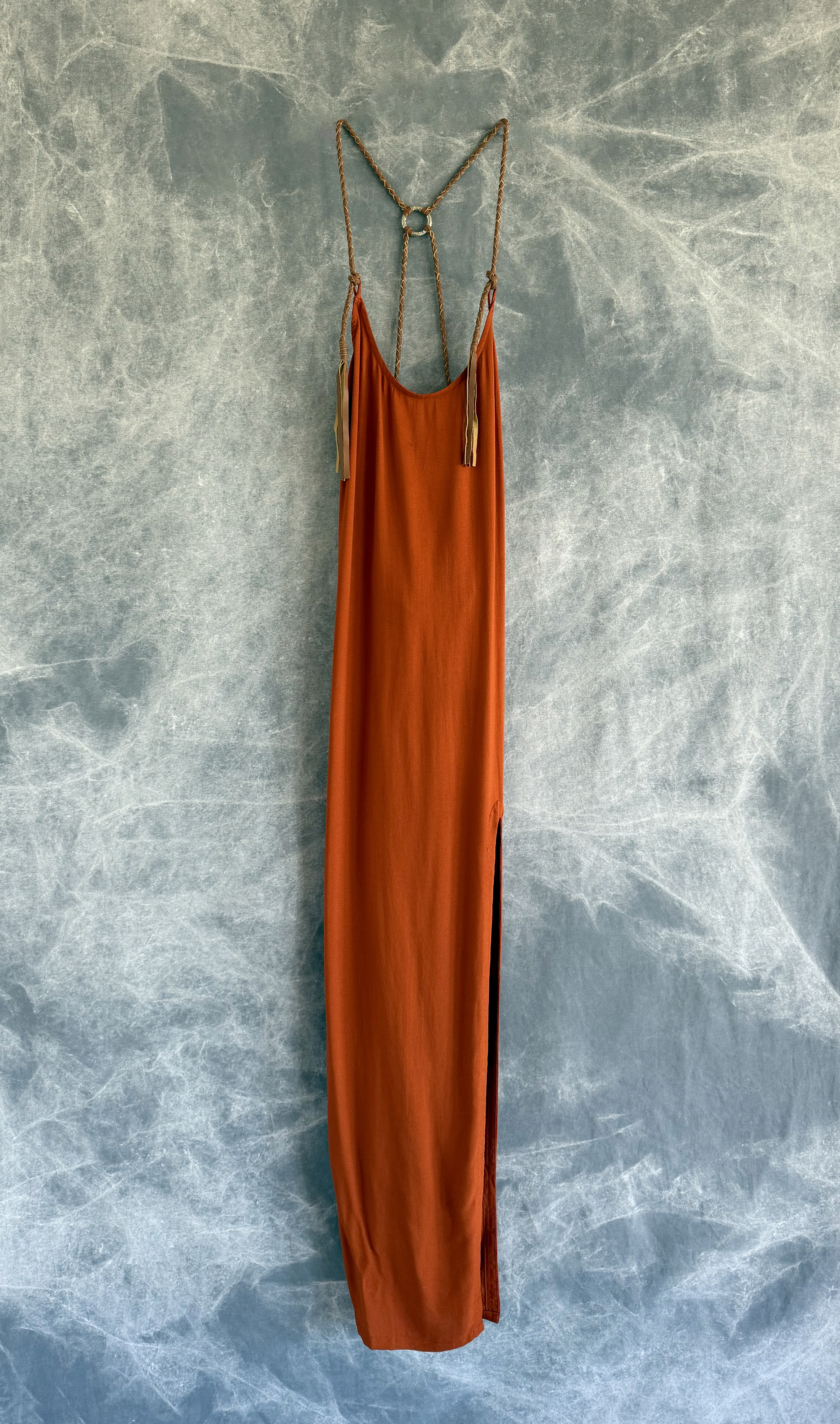 Handmade dress made from a very soft bamboo featuring an open back with adjustable leather strings and a custom brass ring.