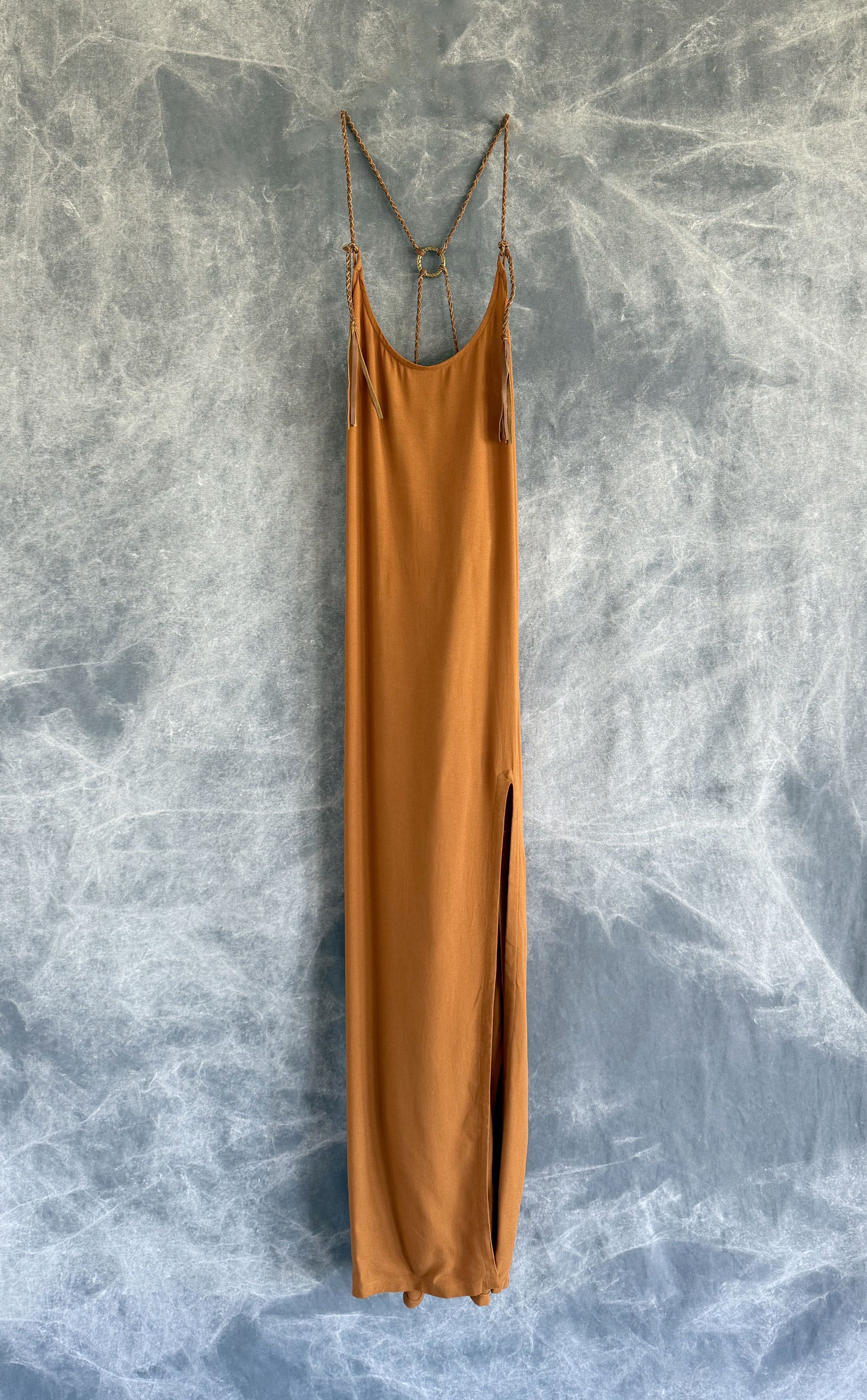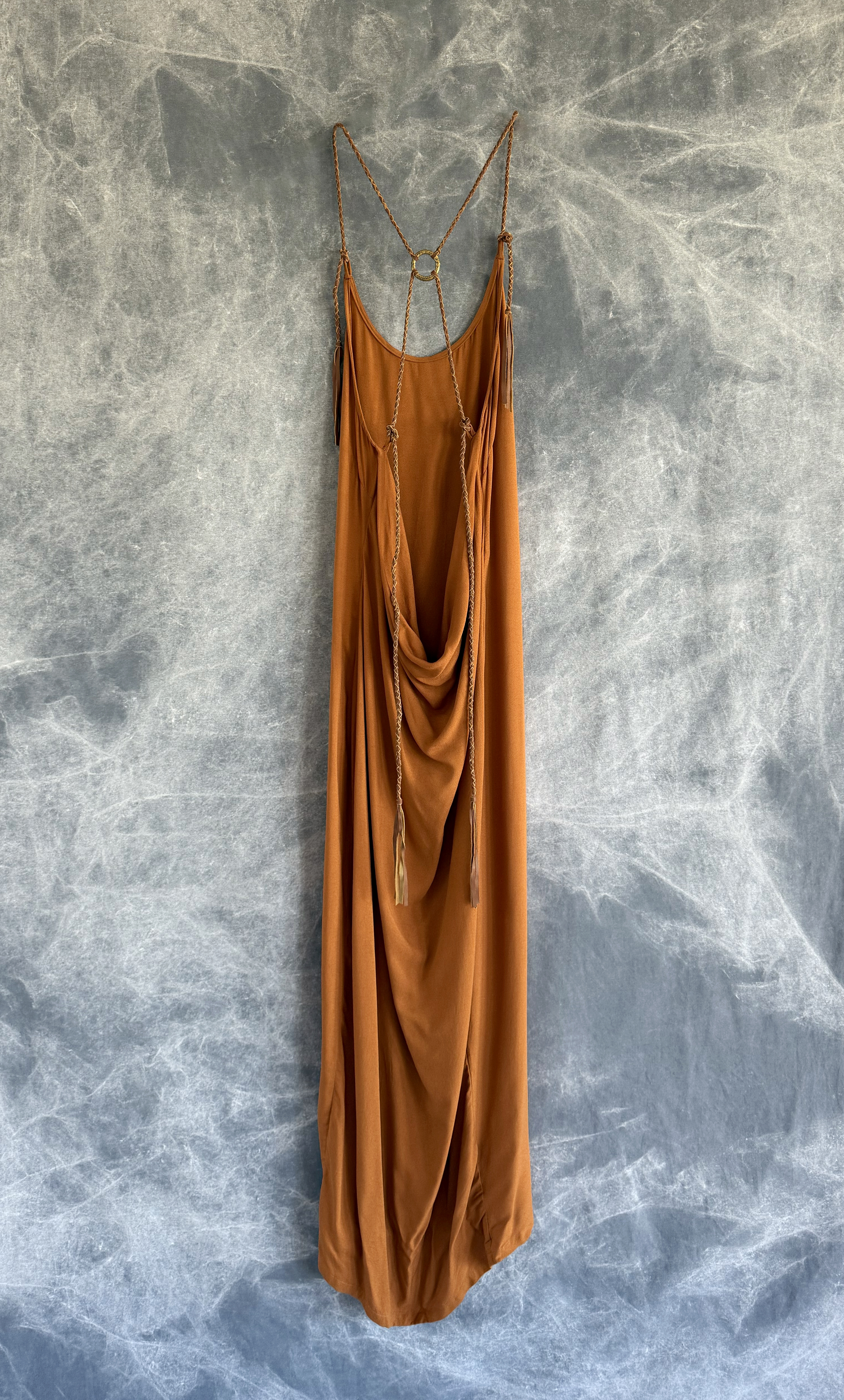 Handmade dress made from a very soft bamboo featuring an open back with adjustable leather strings and a custom brass ring.