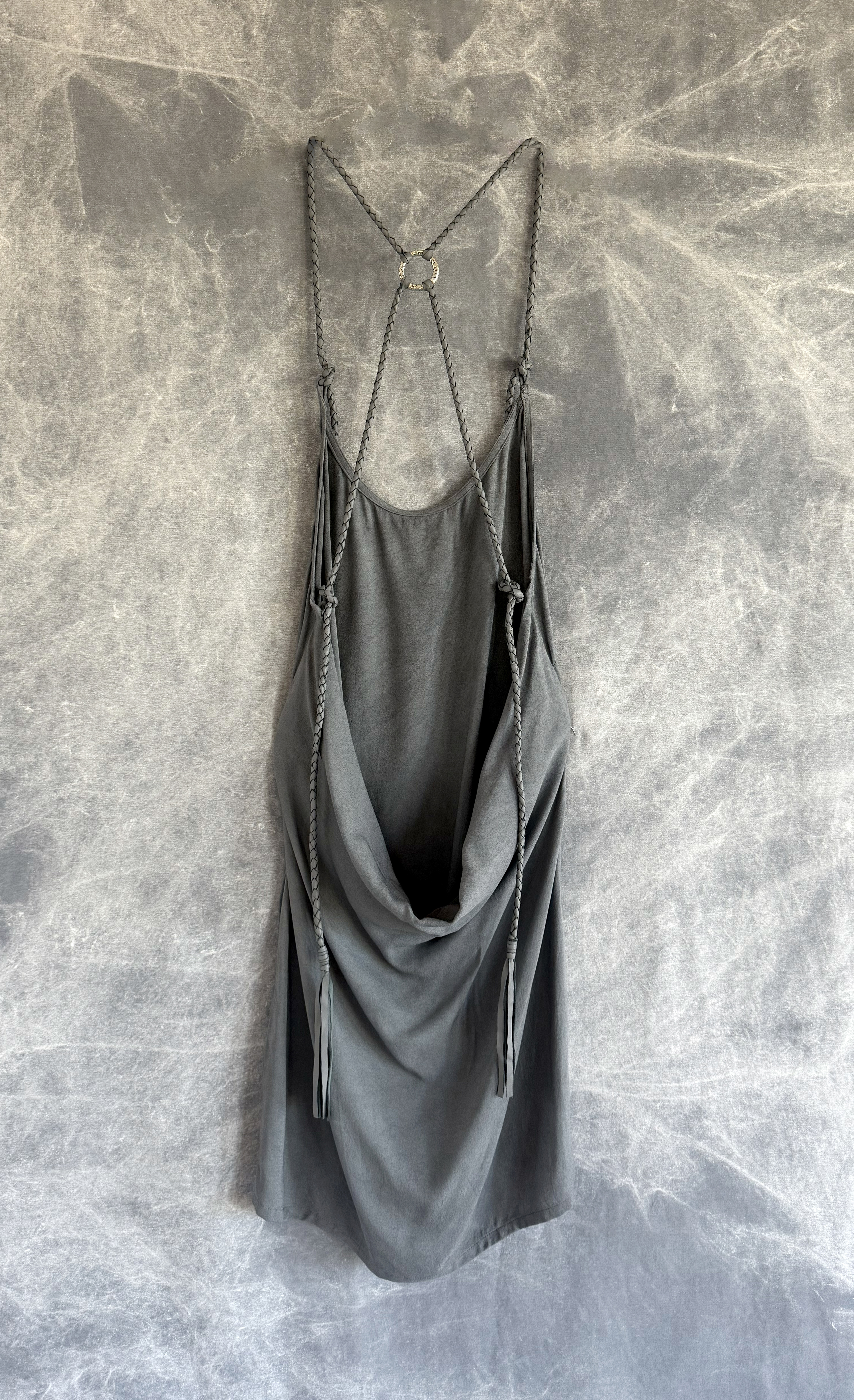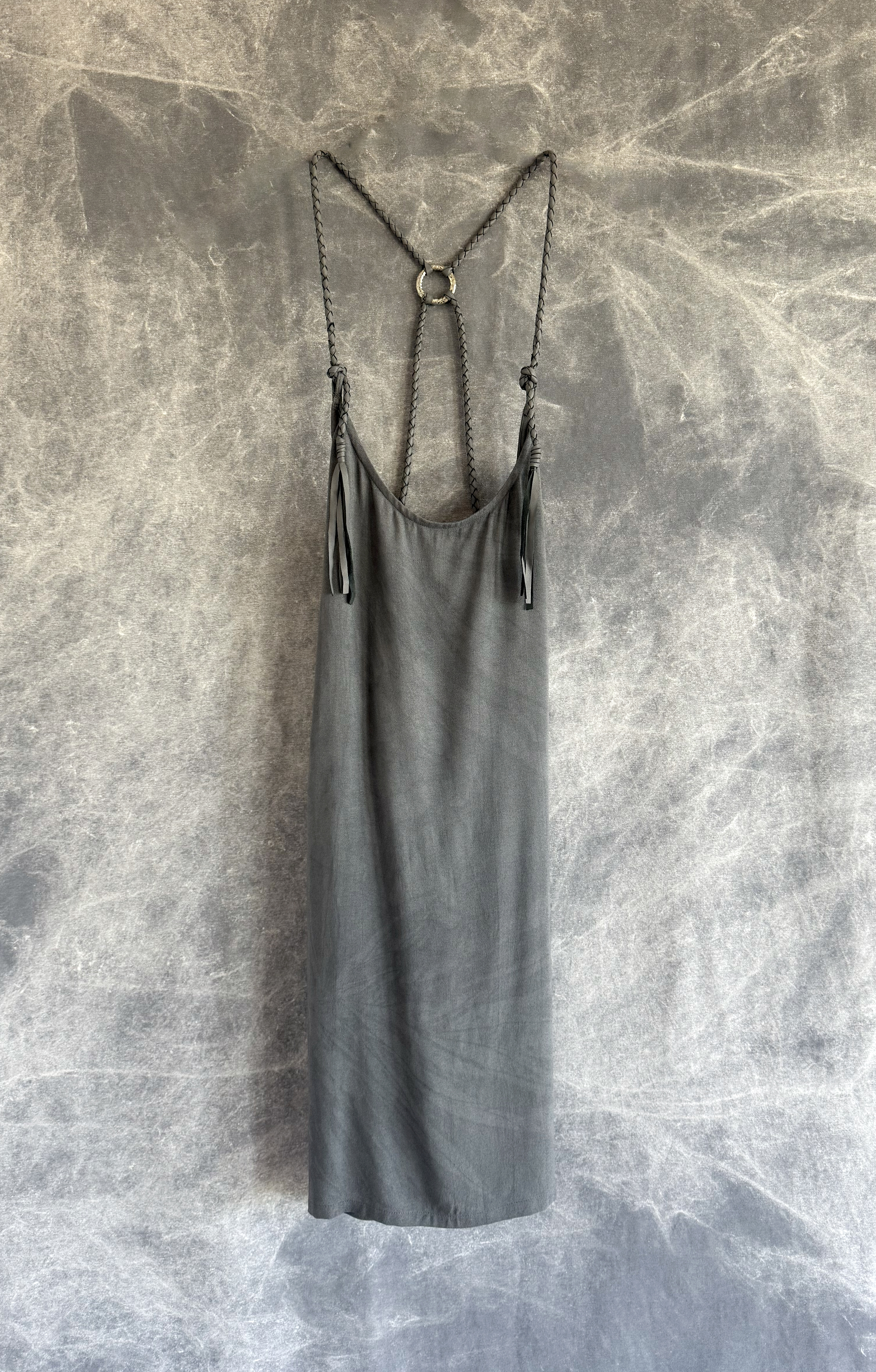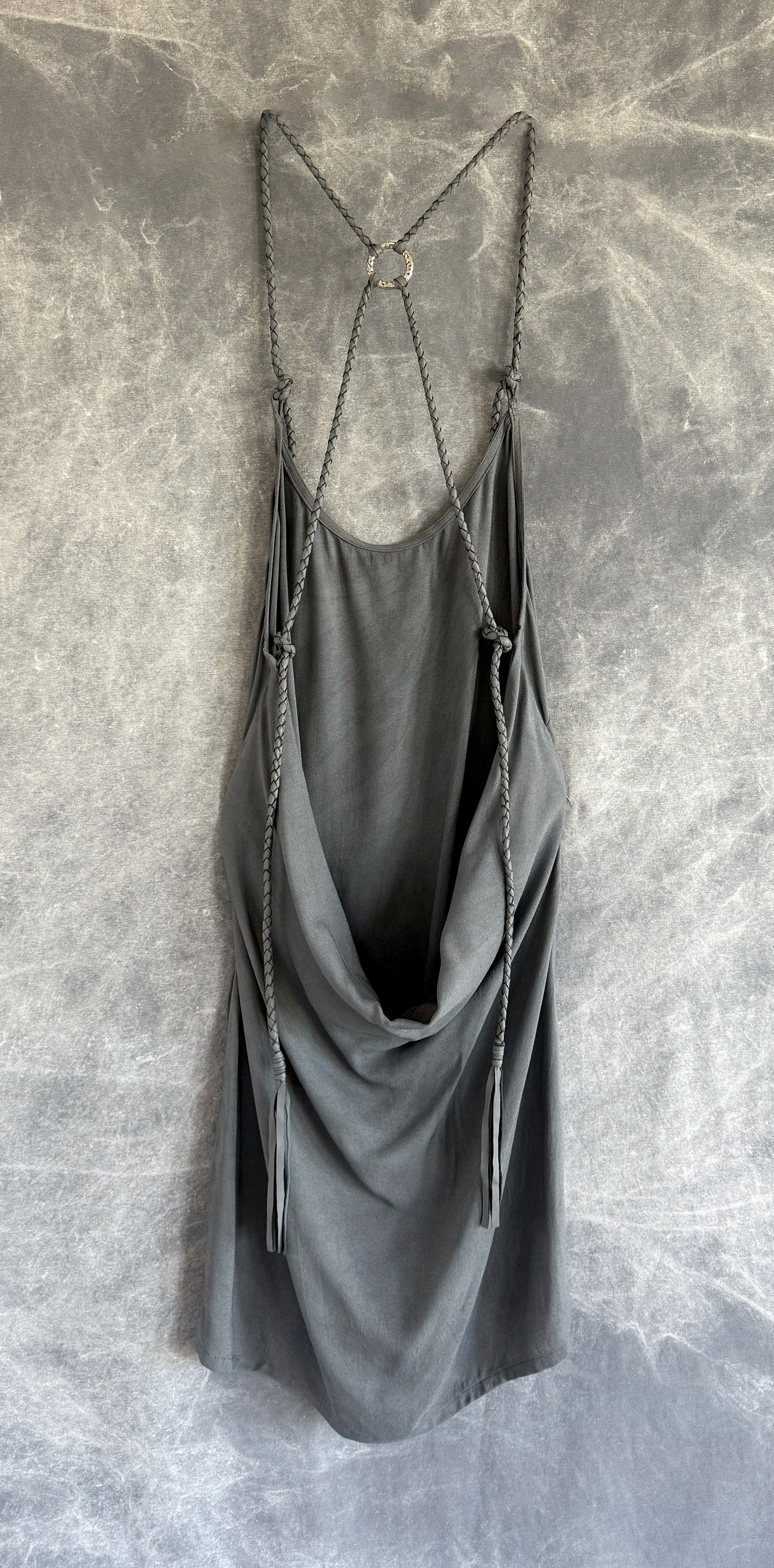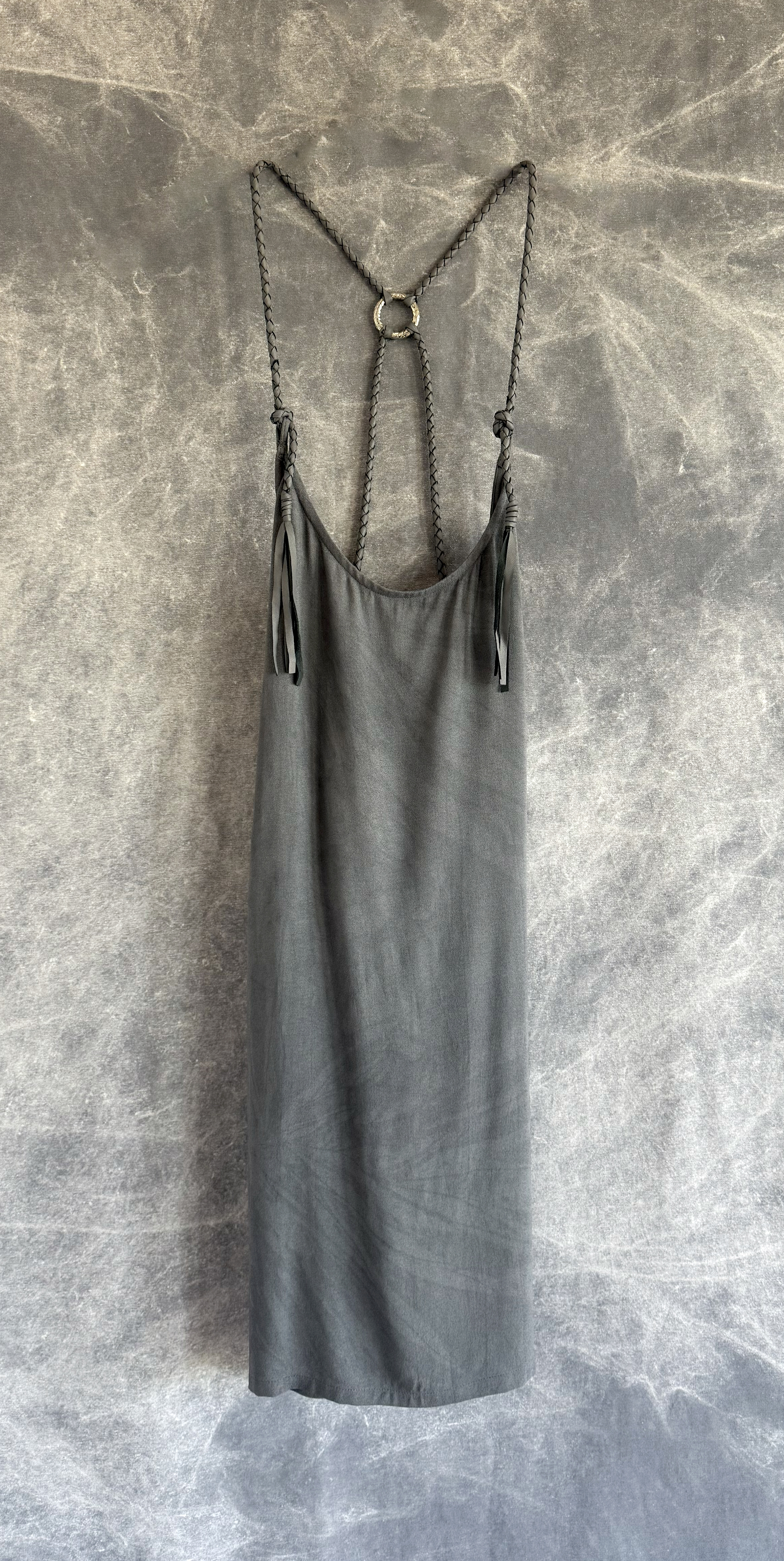 Handmade dress made from a very soft bamboo featuring an open back with adjustable leather strings and a custom brass ring.