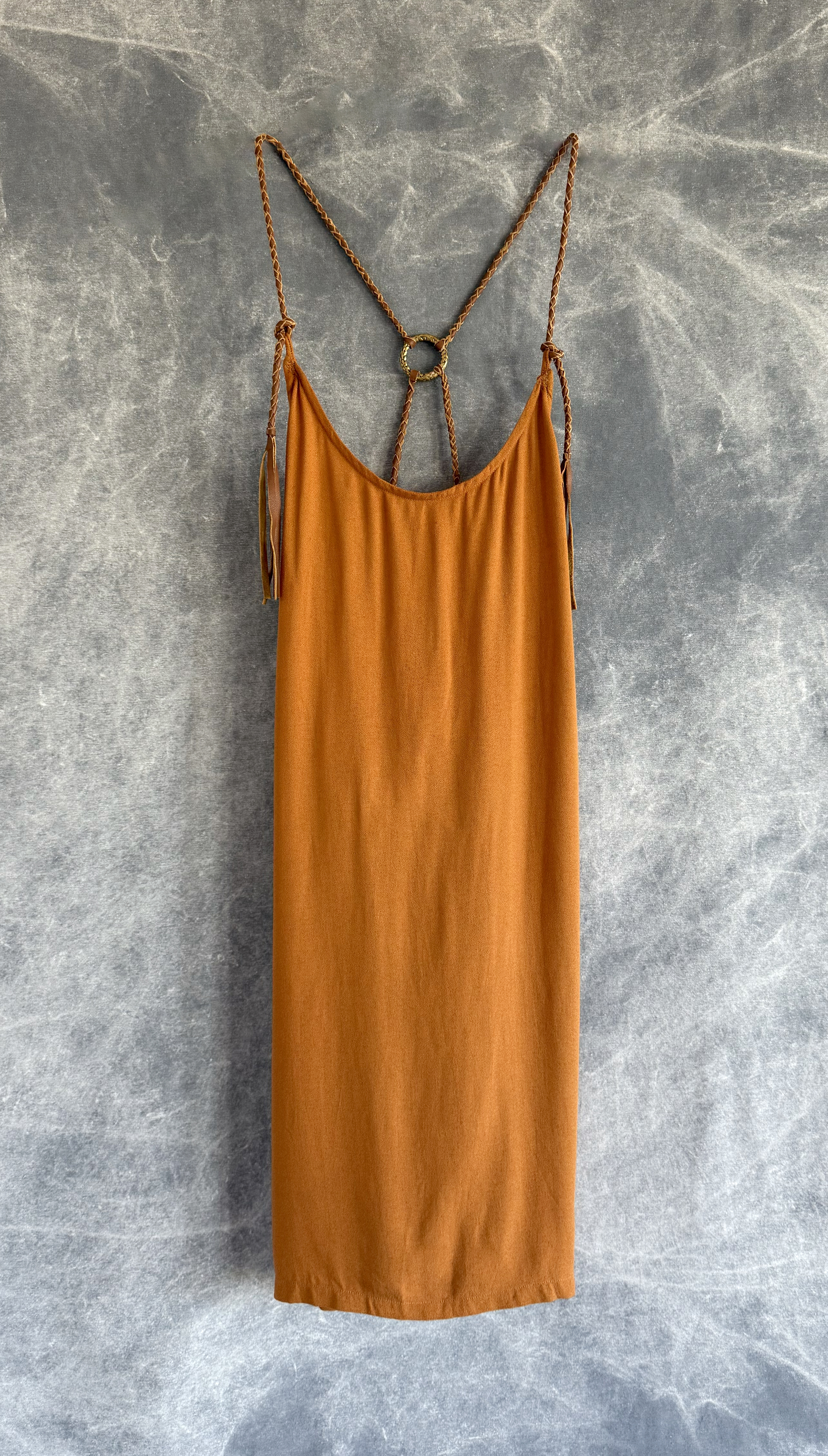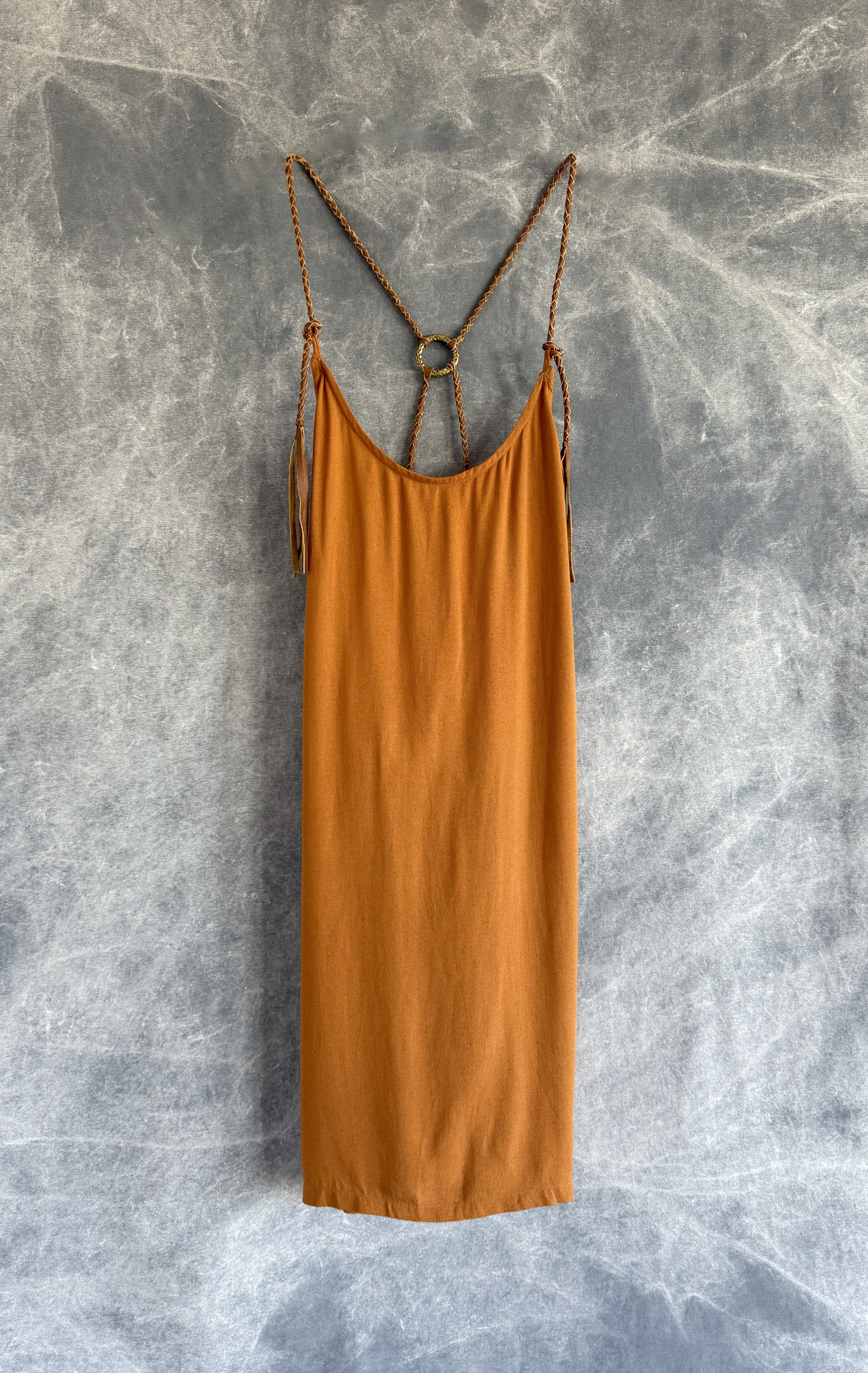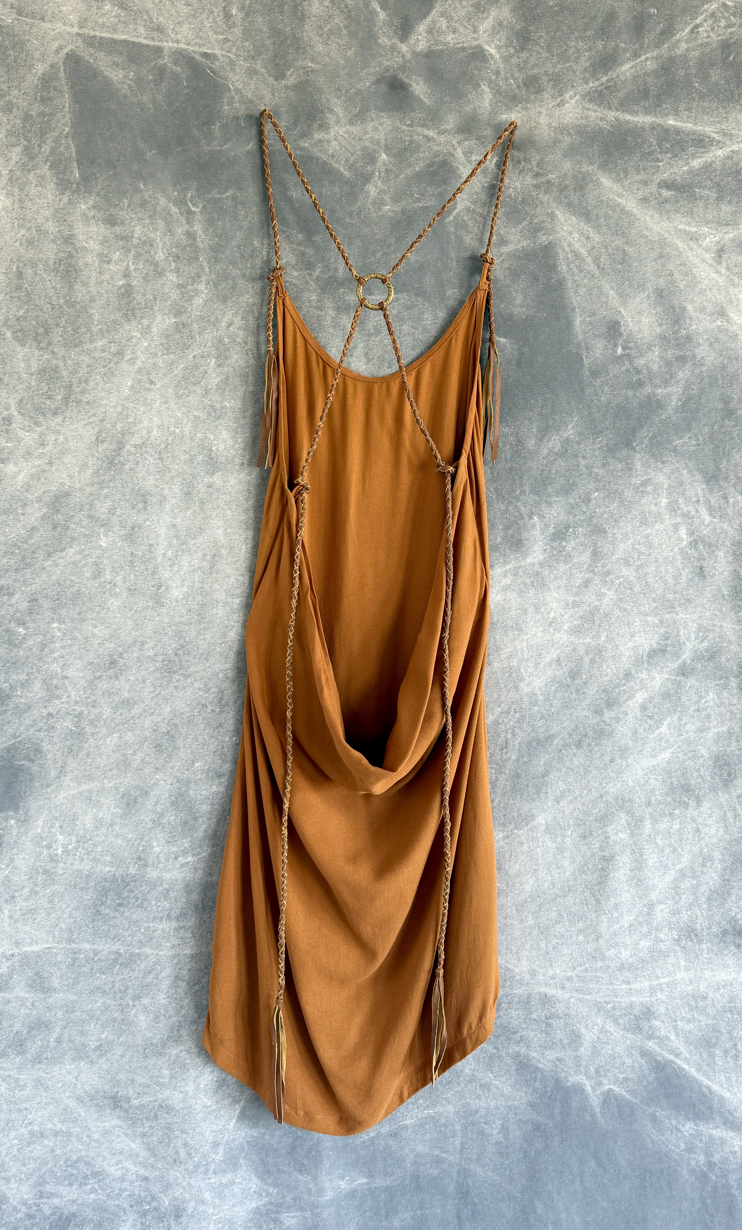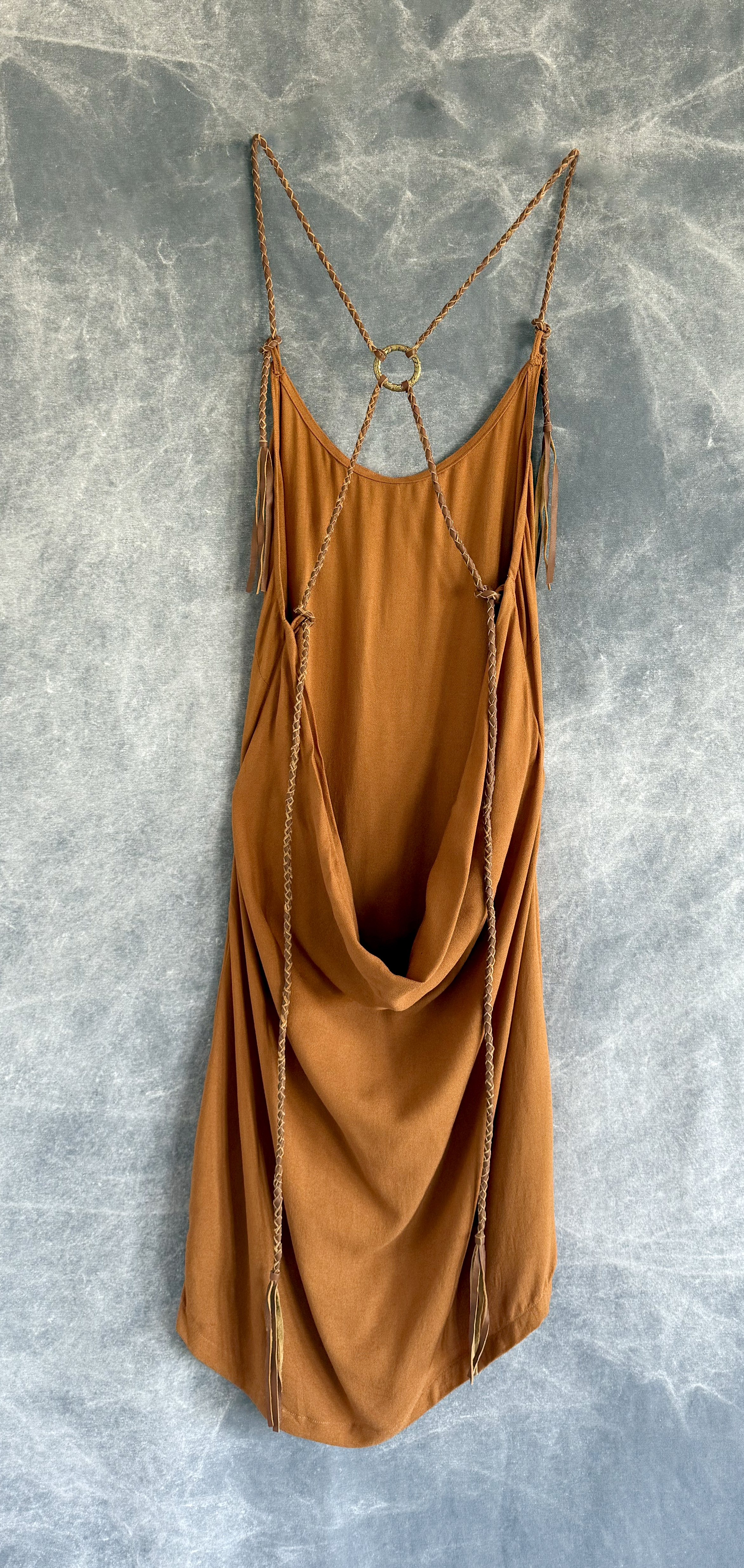 Handmade dress made from a very soft bamboo featuring an open back with adjustable leather strings and a custom brass ring.