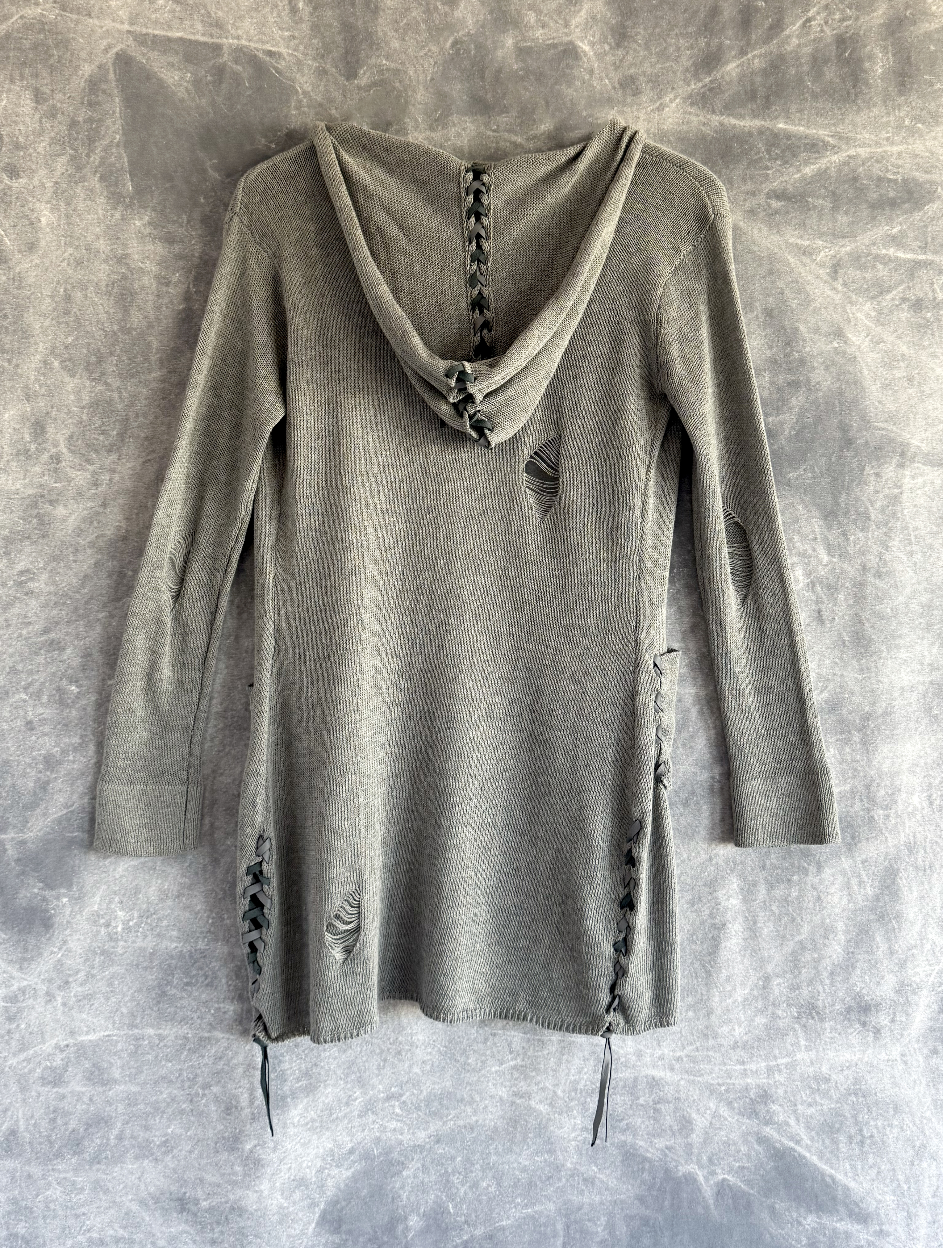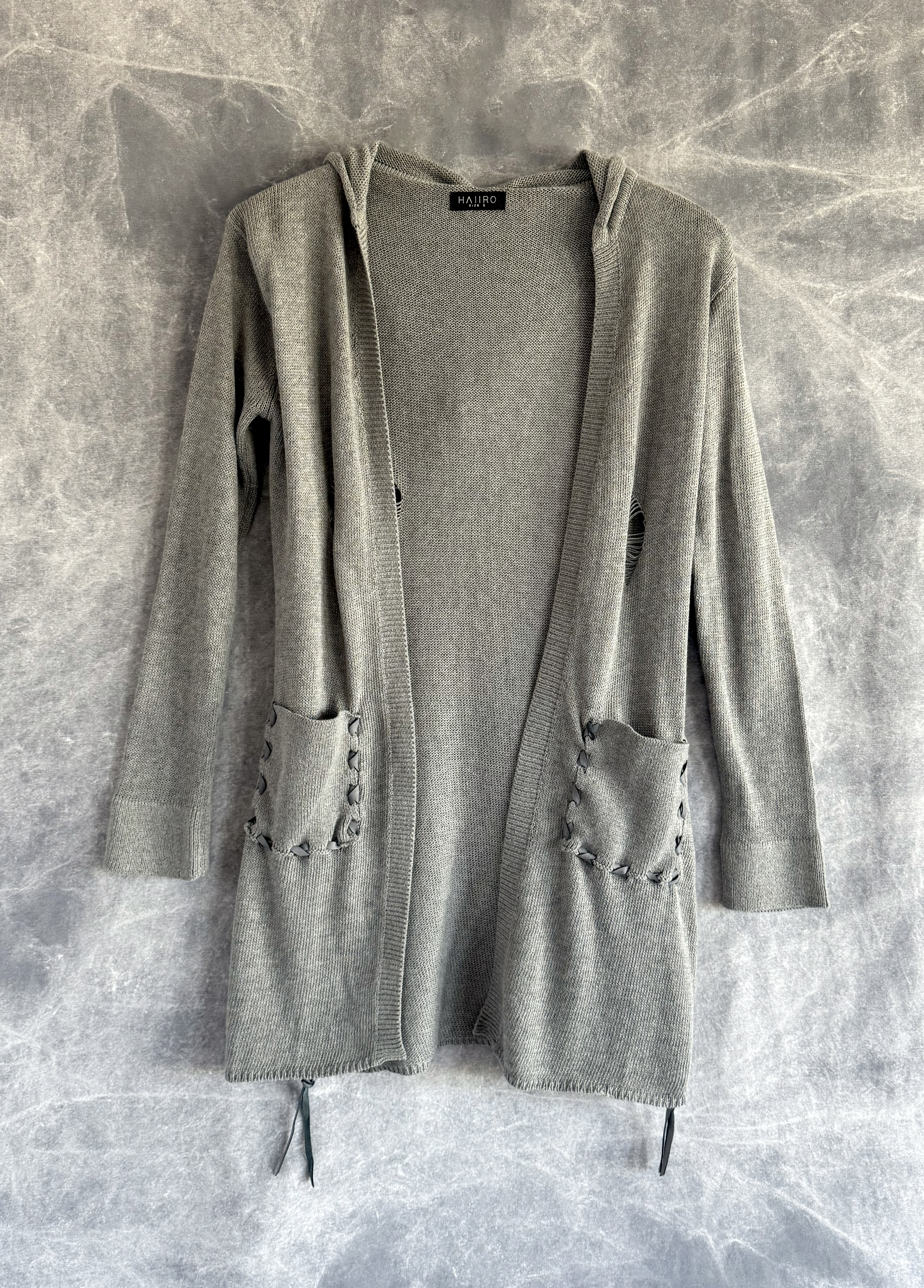 Handmade knit jacket made from a very soft cotton featuring a detailed leather design made from sheep skin.