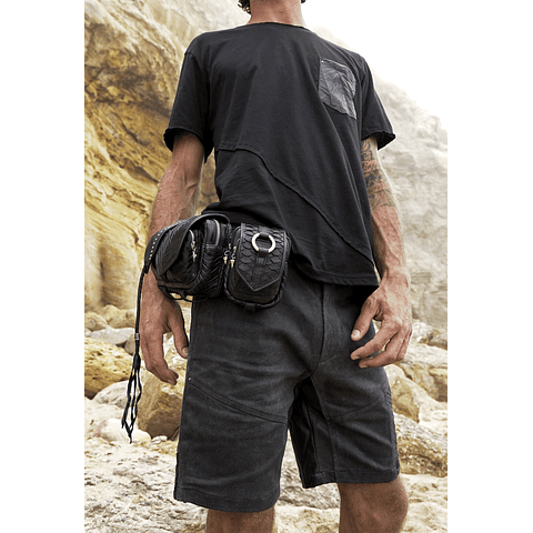 Handmade shorts made from a very soft stretch twill with a wax treatment featuring a very detailed leather design made from goat leather.