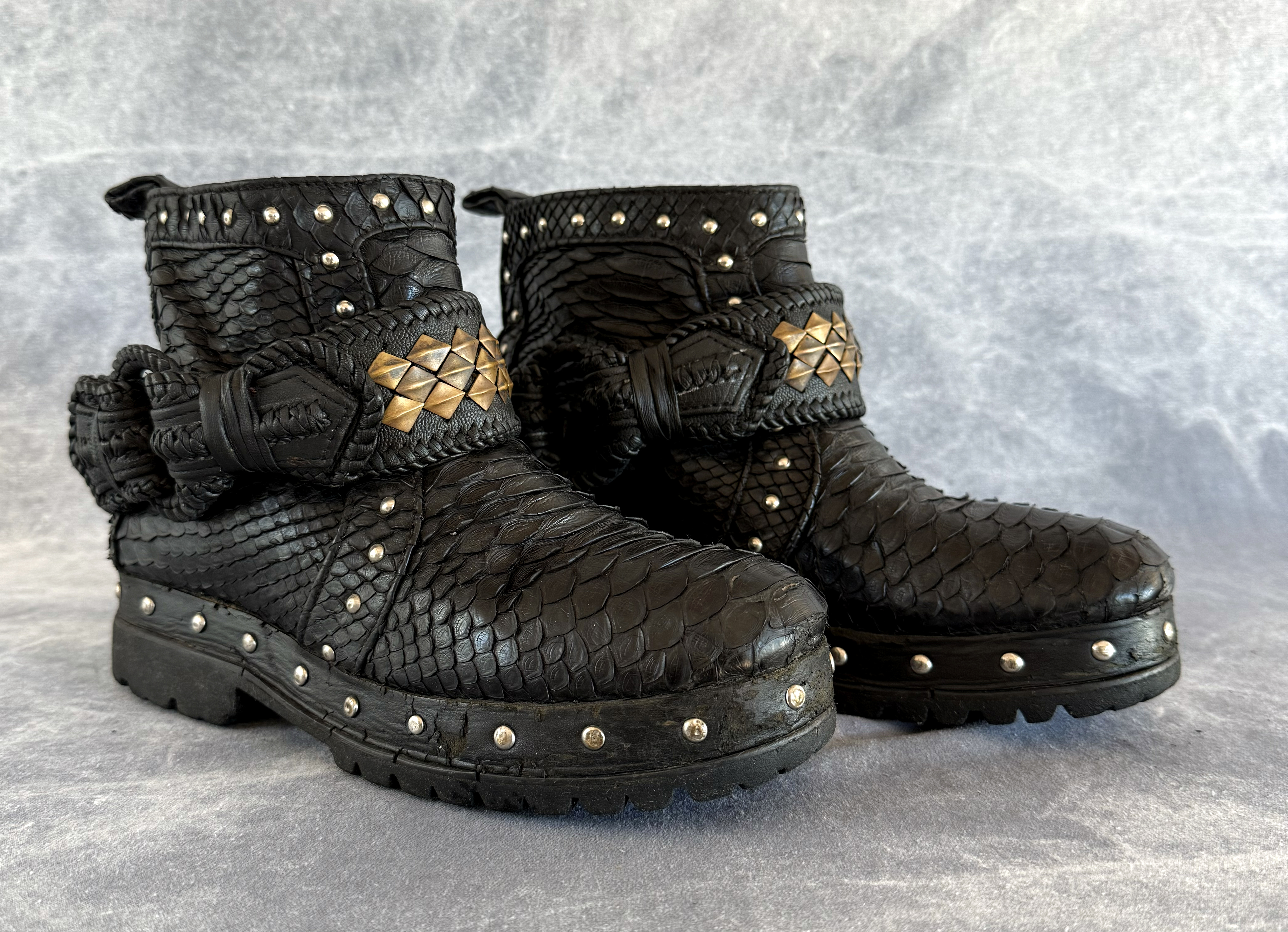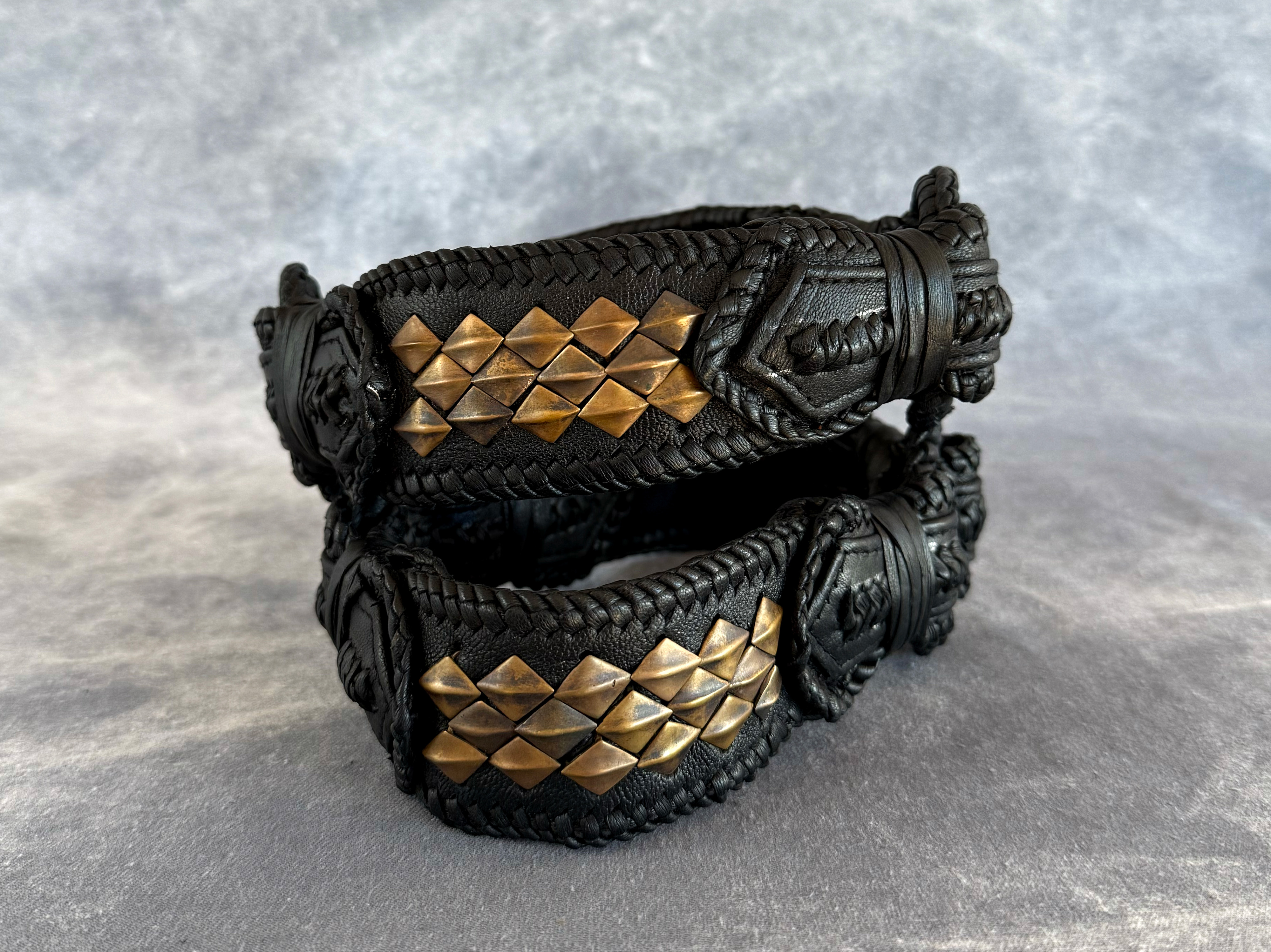 Handmade boot cuffs with a very detailed leather design made from goat leather featuring our crocodile studs in brass.