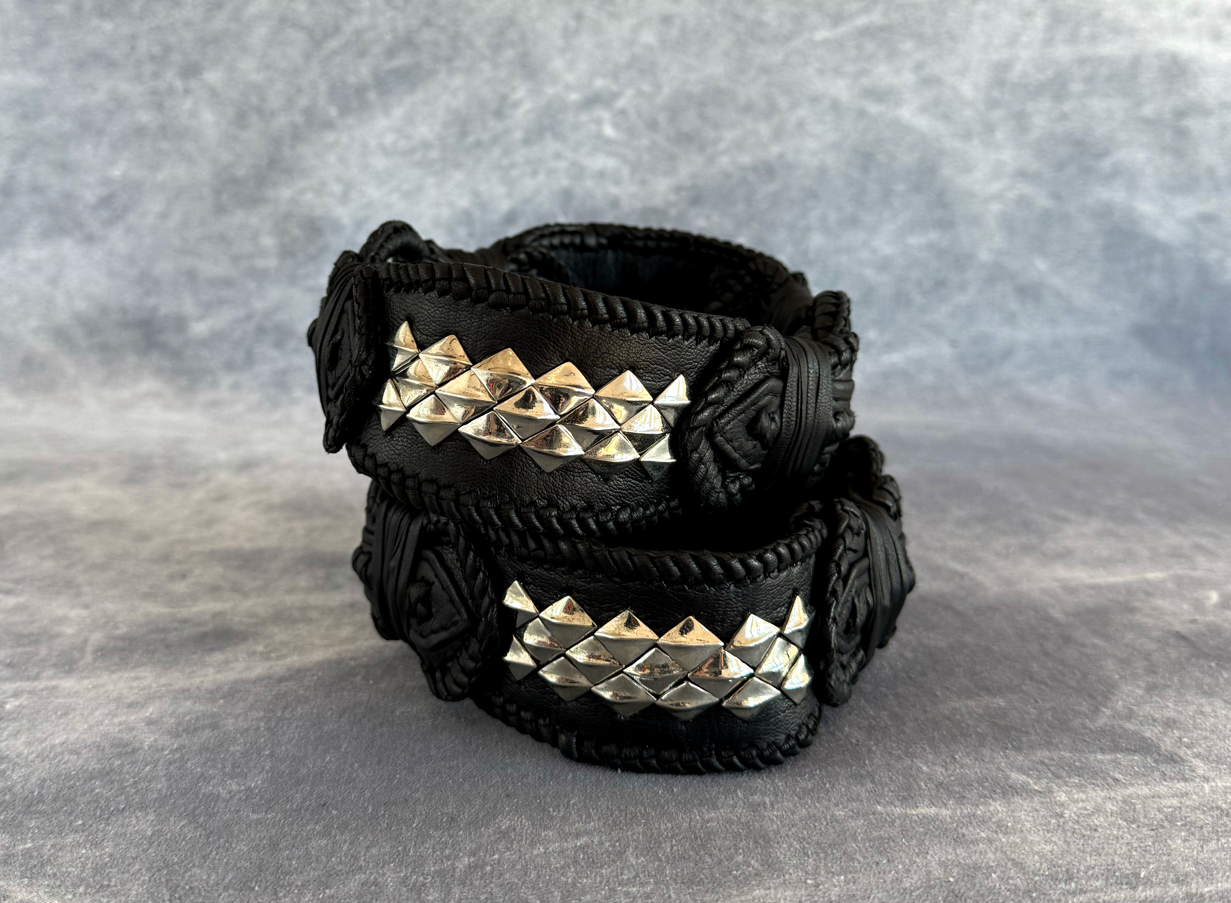Handmade boot cuffs with a very detailed leather design made from goat leather featuring our crocodile studs in white brass.