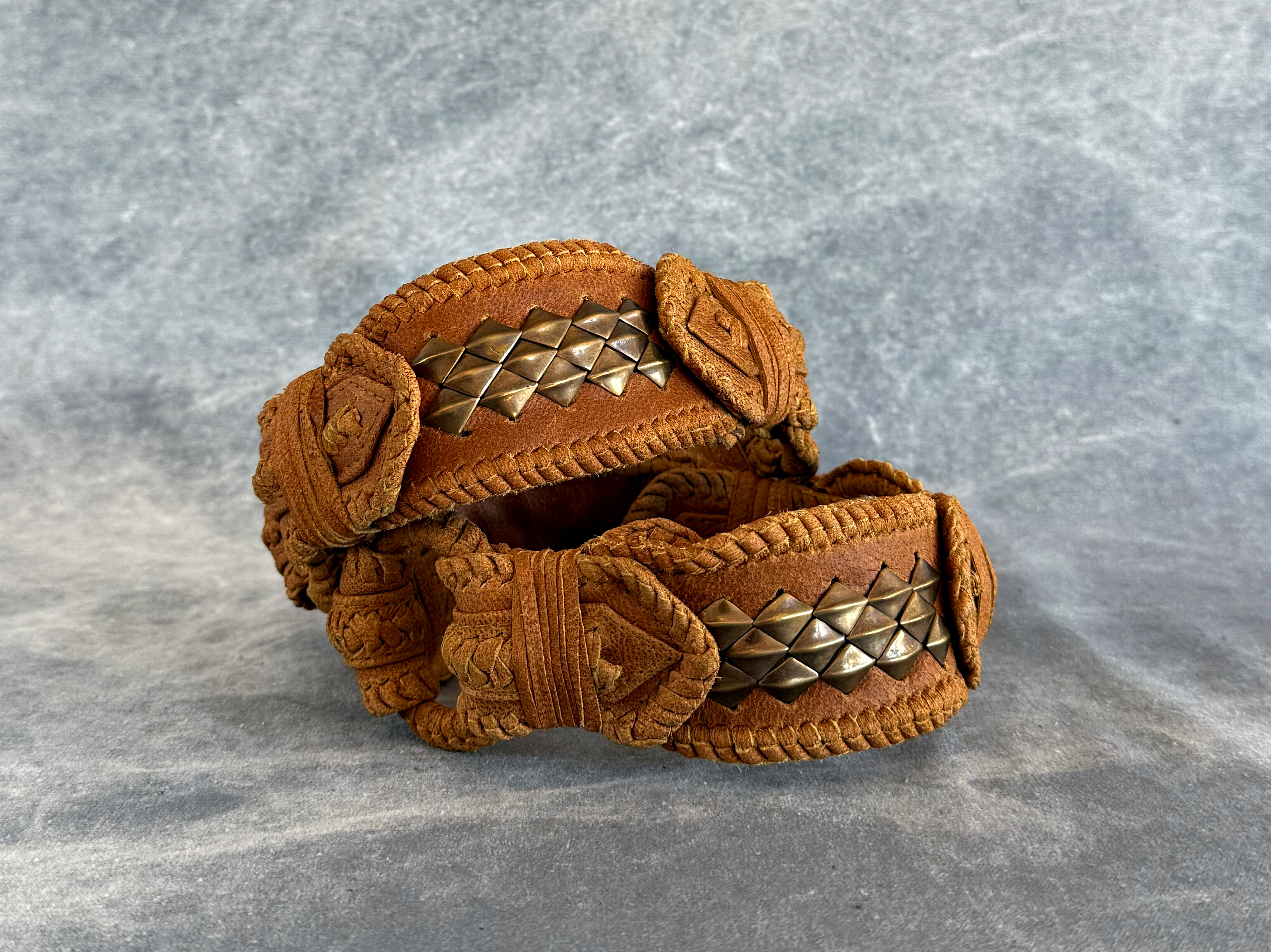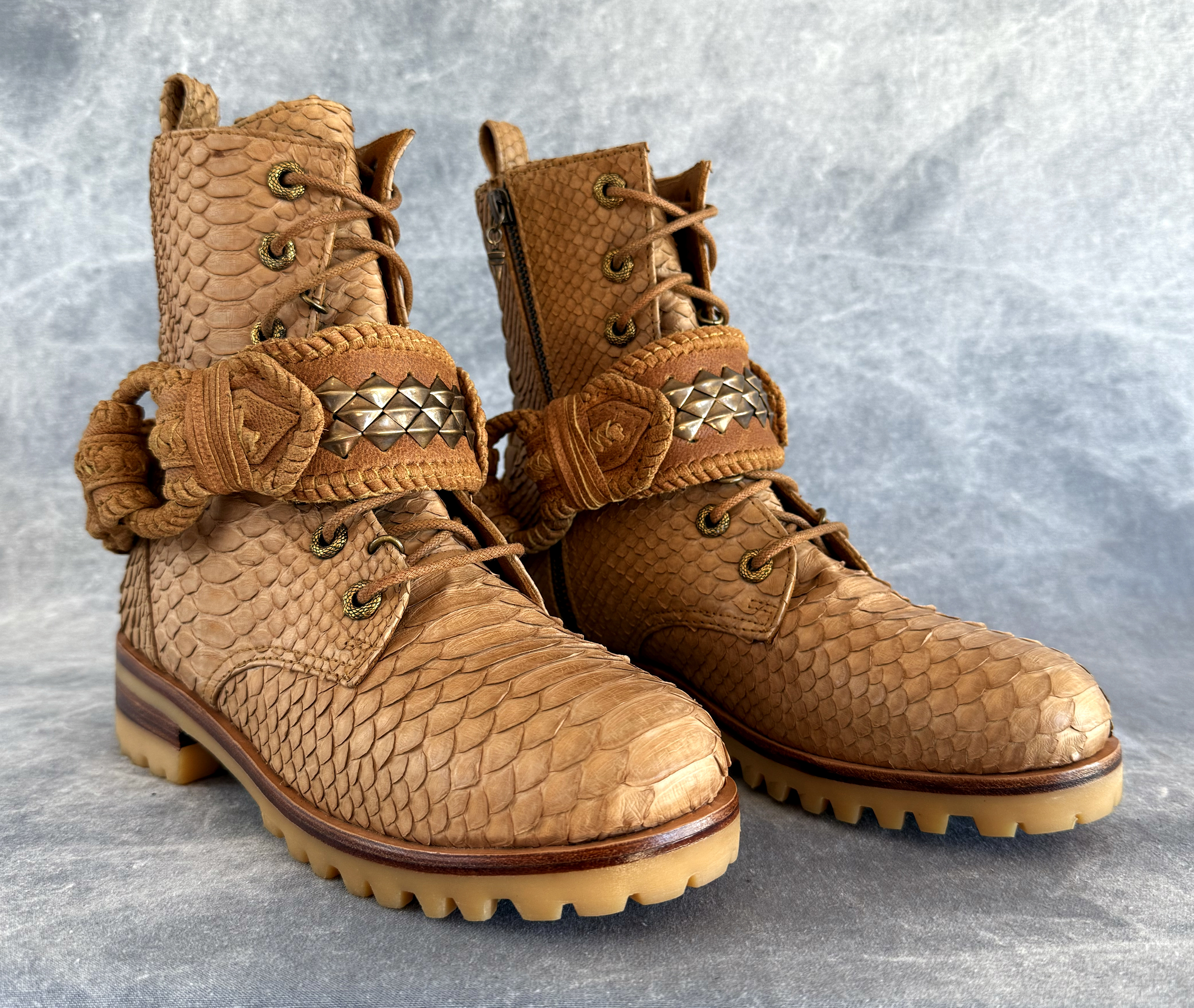 Handmade boot cuffs with a very detailed leather design made from goat leather featuring our crocodile studs in brass.