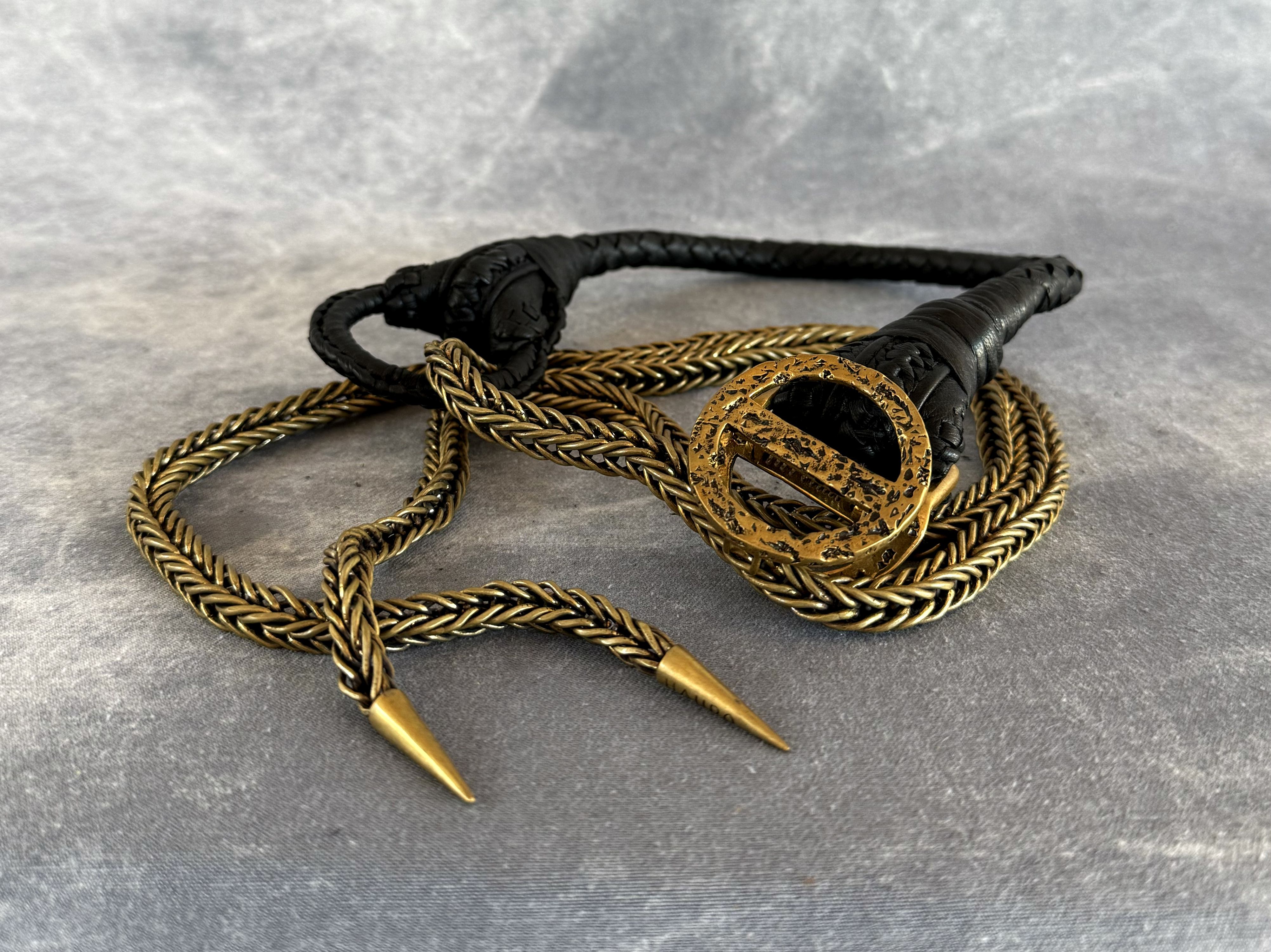 Handmade belt with a very detailed leather design made from goat leather with a combination of an intricate chain made from brass.