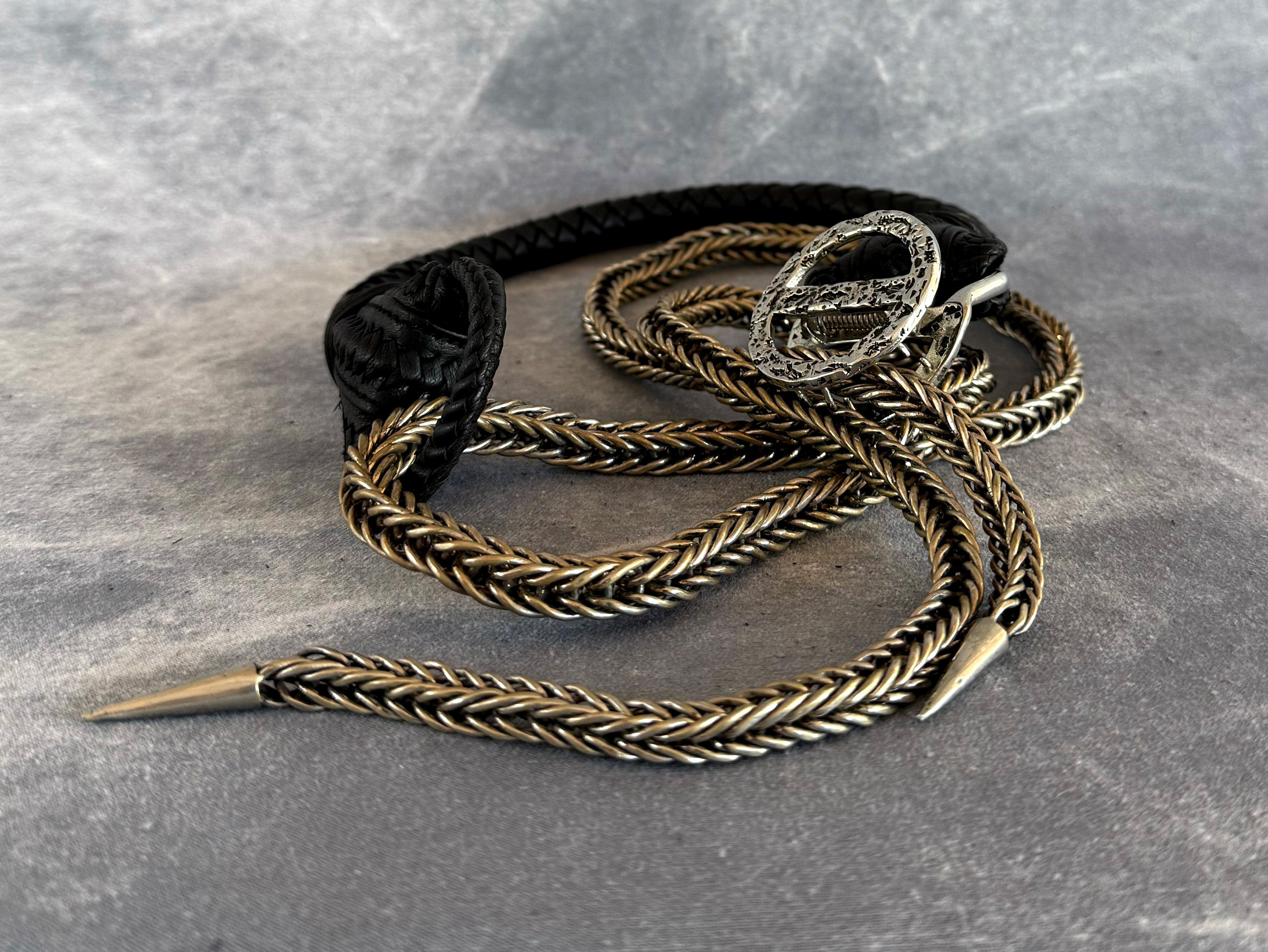 Handmade belt with a very detailed leather design made from goat leather with a combination of an intricate chain made from brass.
