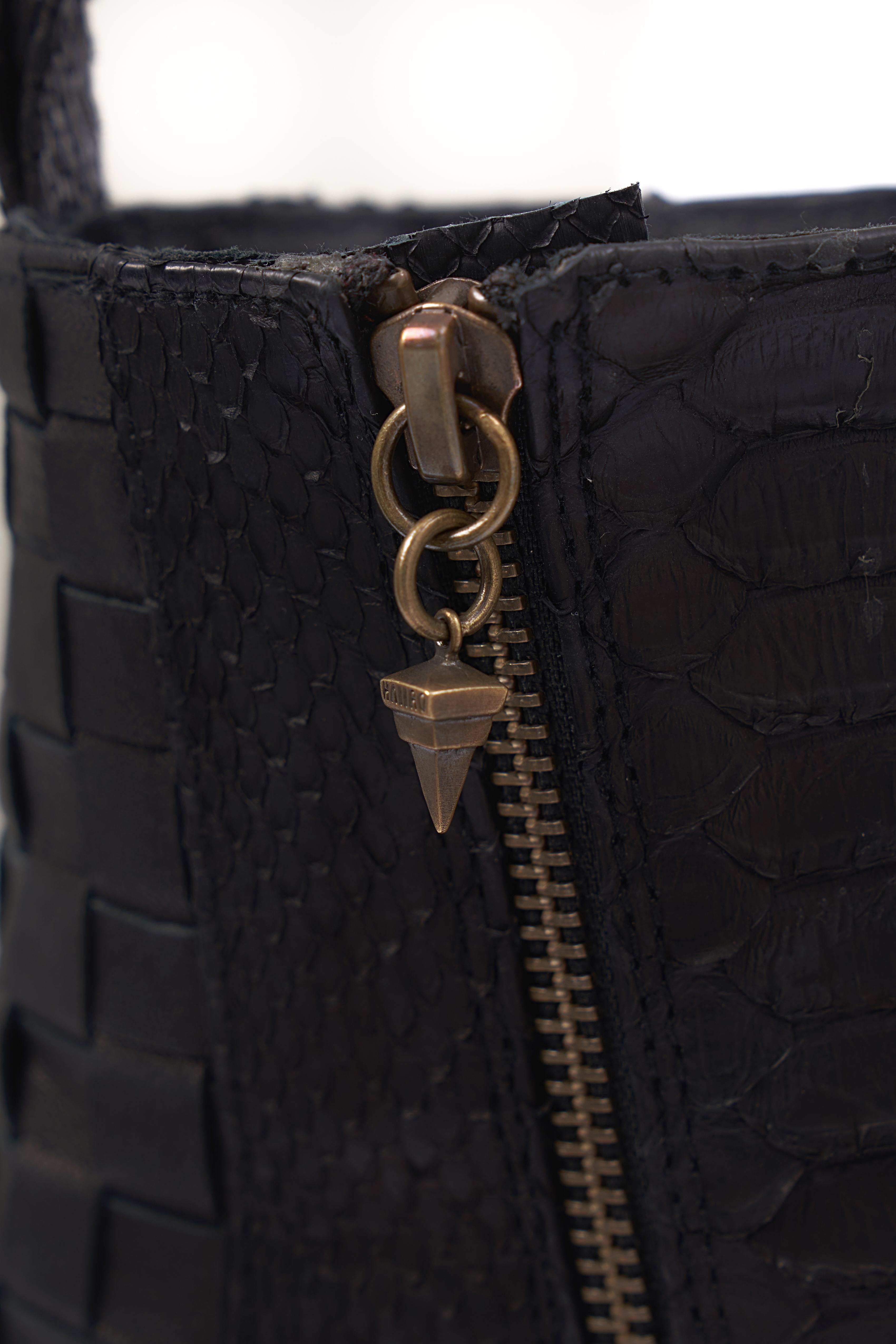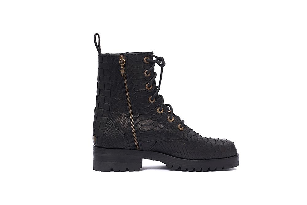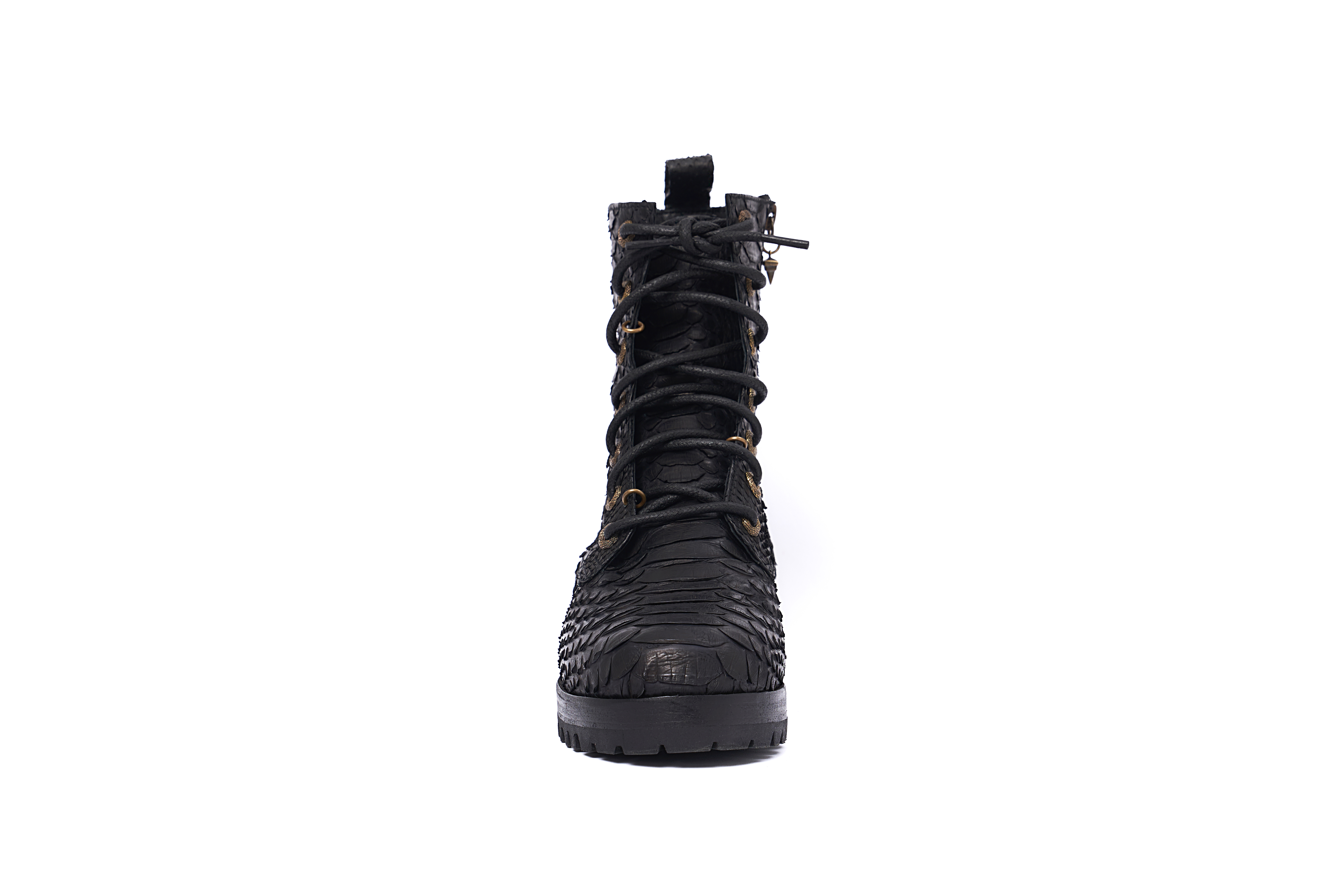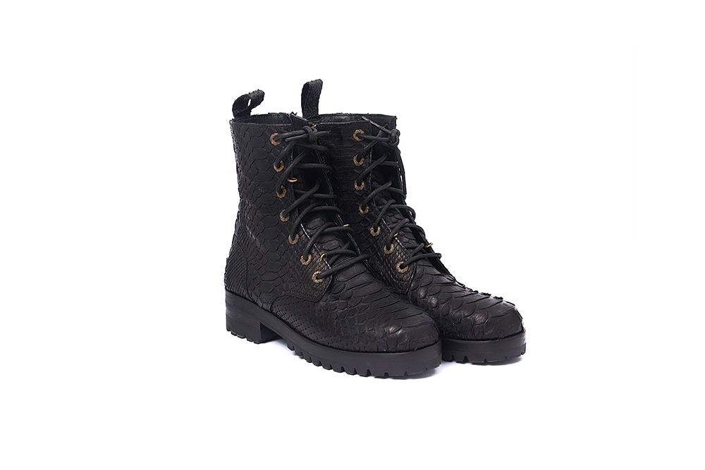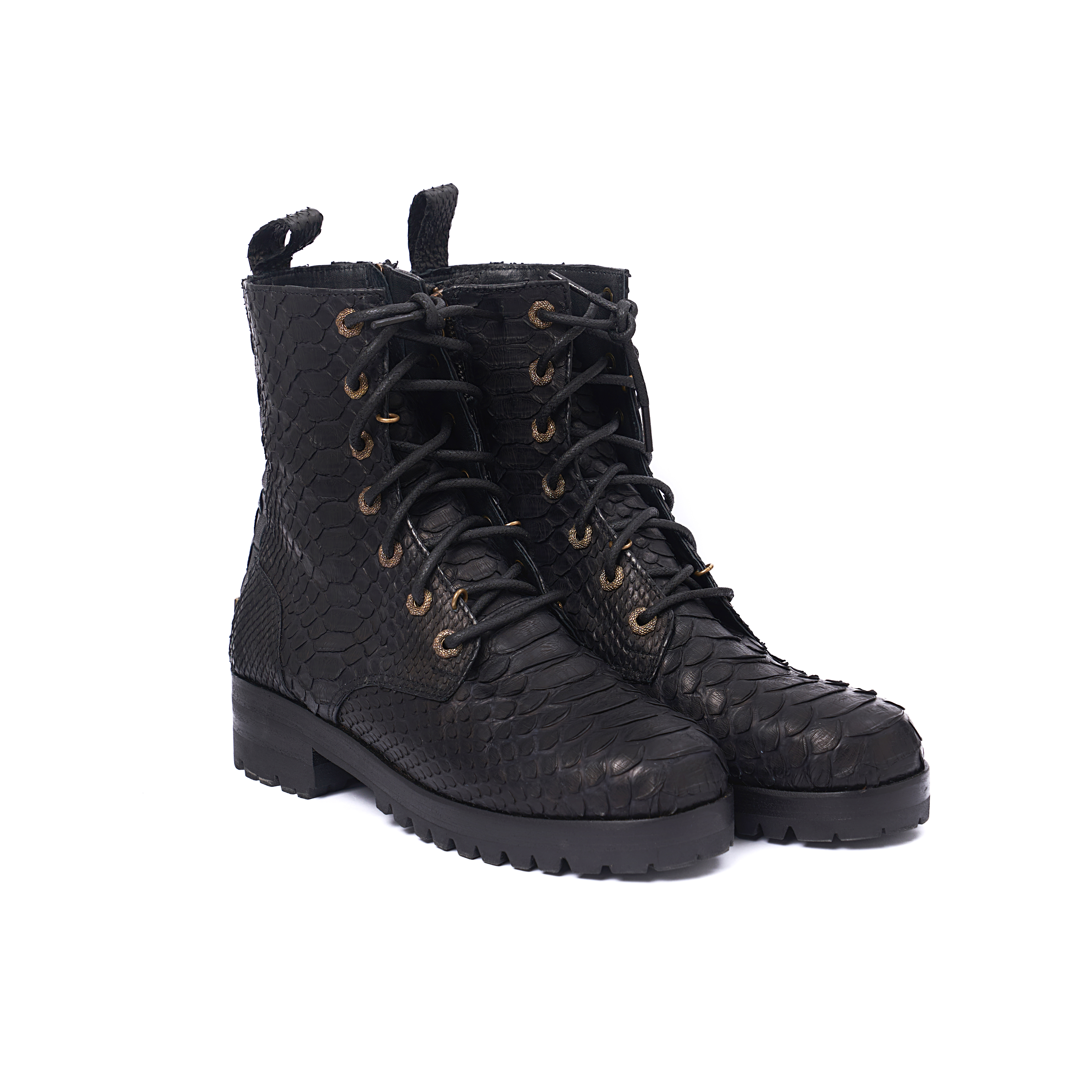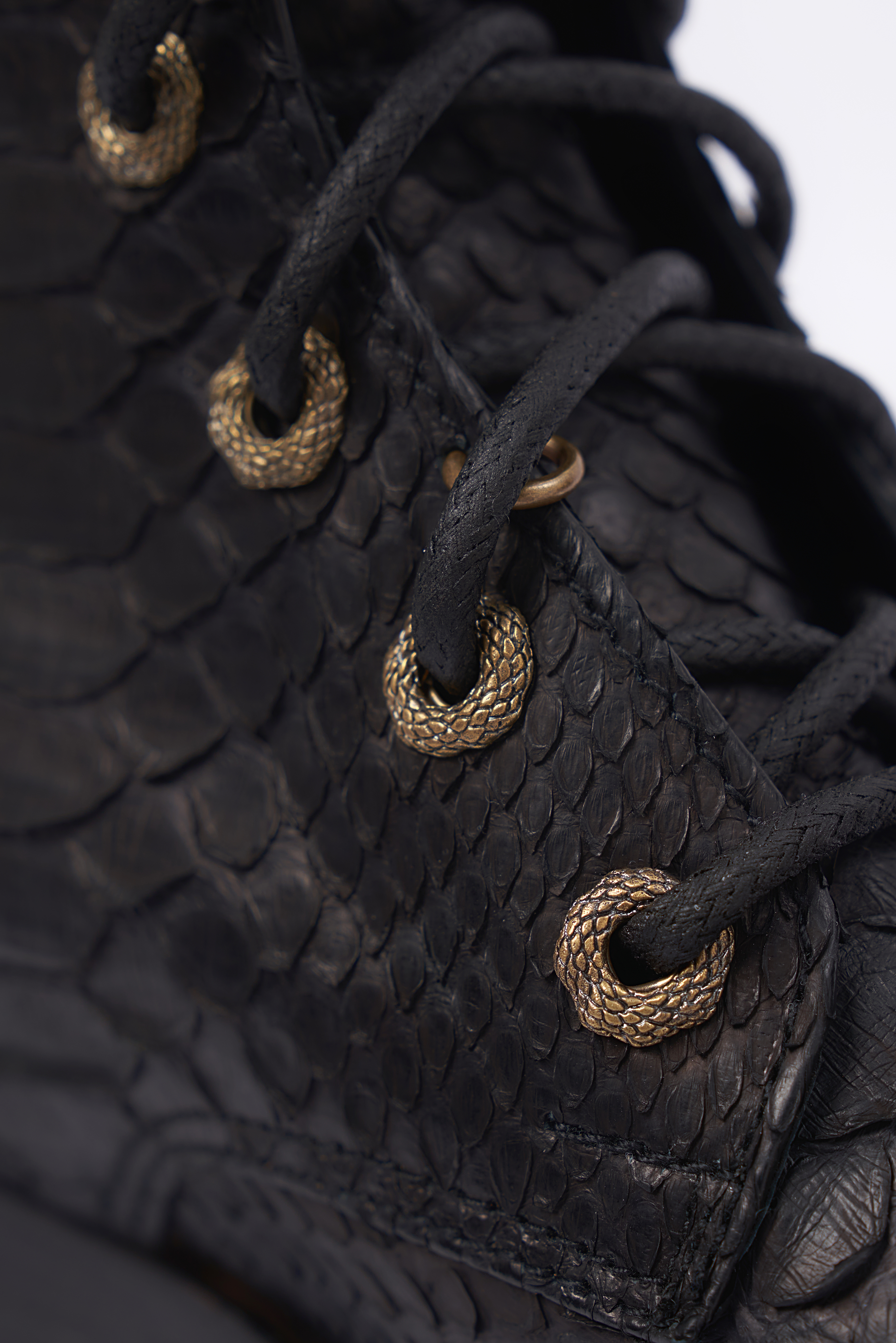 Handmade boots made from a very soft python skin, presenting a rounded toe shape, featuring custom eyelets and a pull tab at the rear.