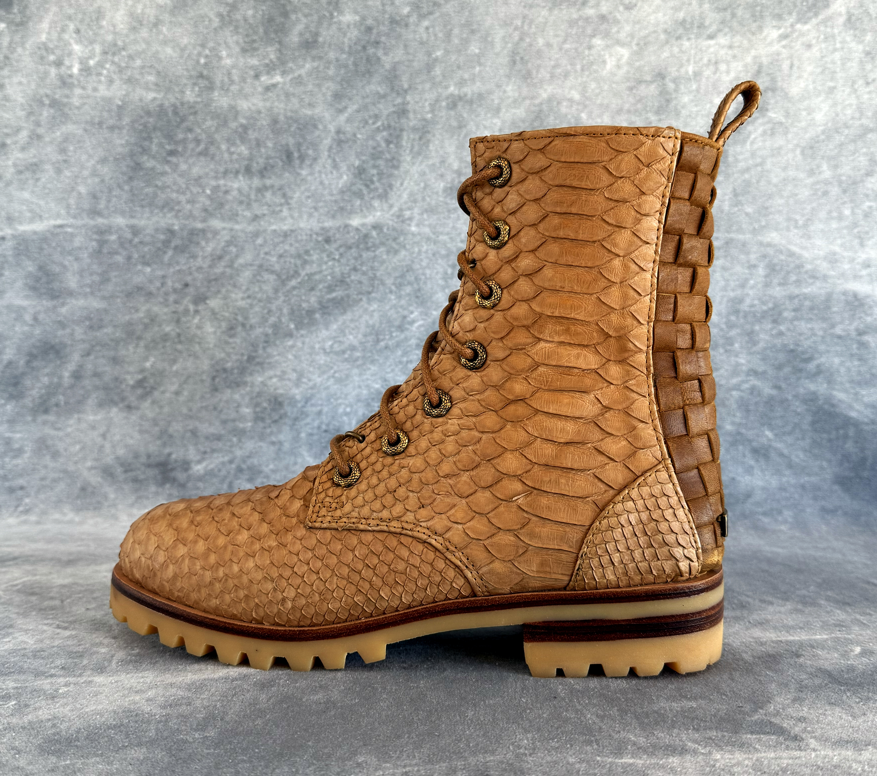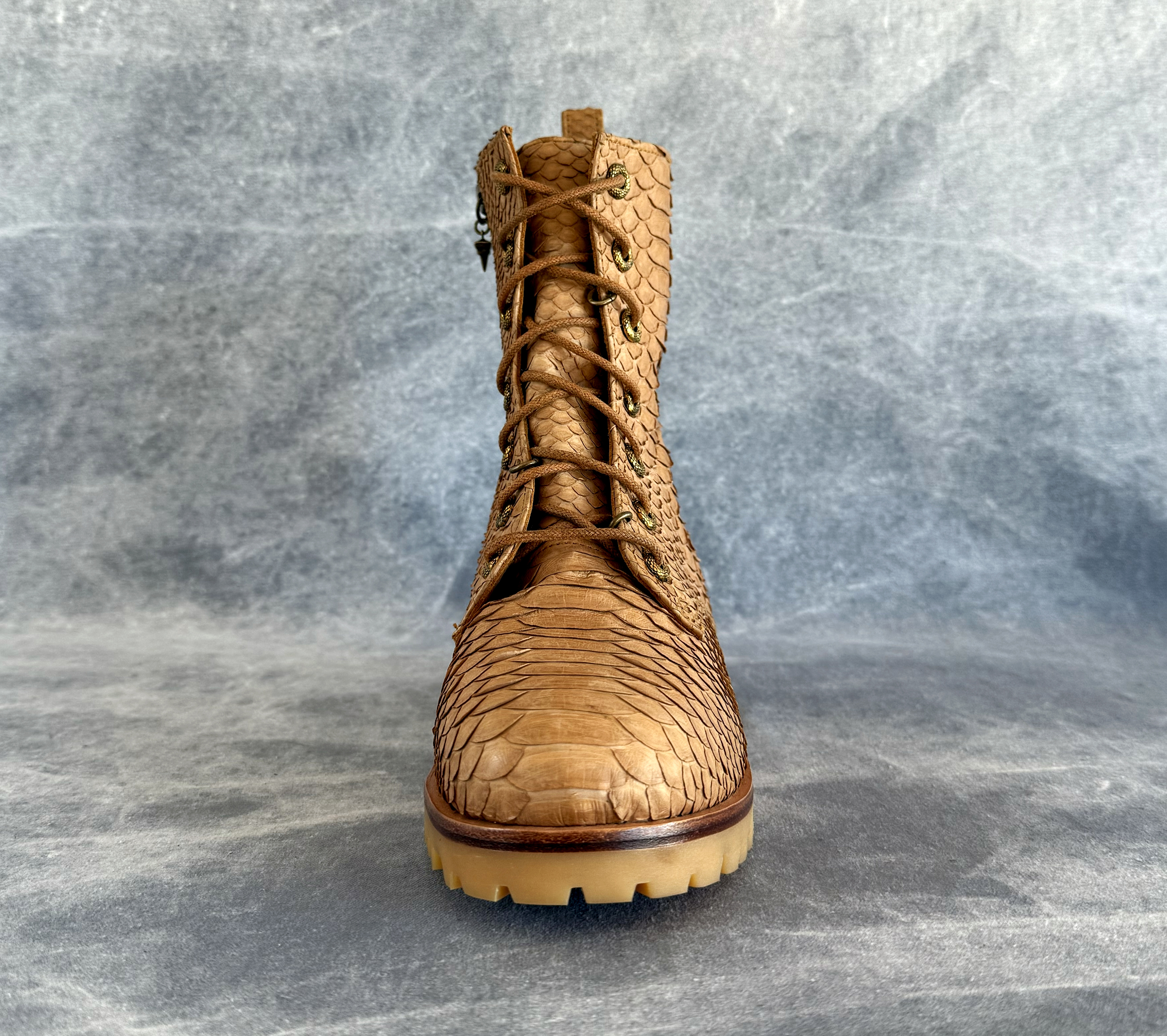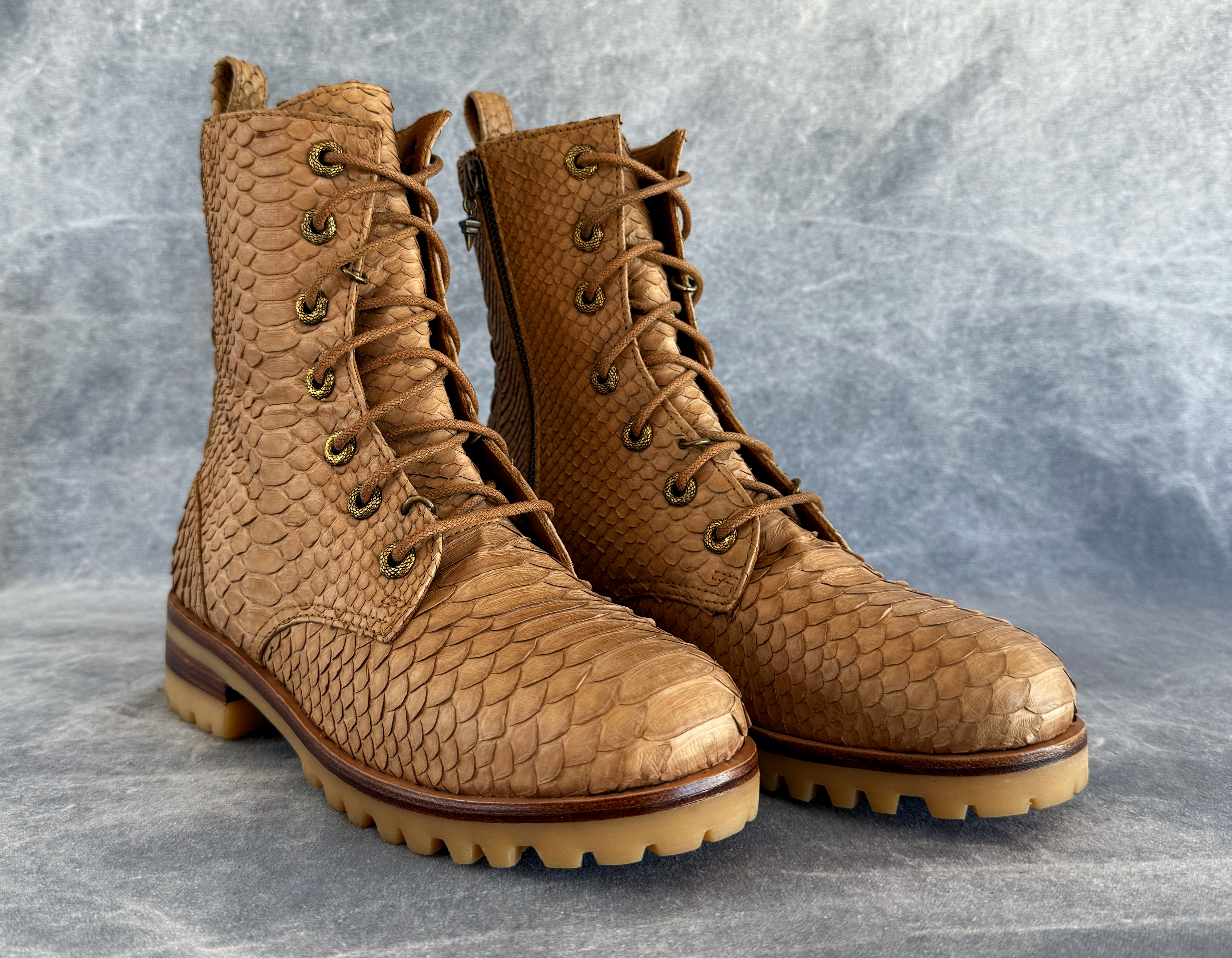 Handmade boots made from a very soft python skin, presenting a rounded toe shape, featuring custom eyelets and a pull tab at the rear. 100% goat leather lining. Leather and rubber outsole with chunky low heel.