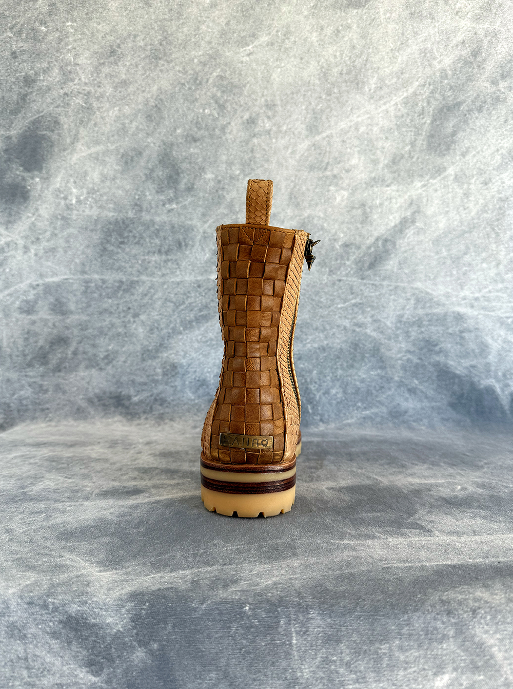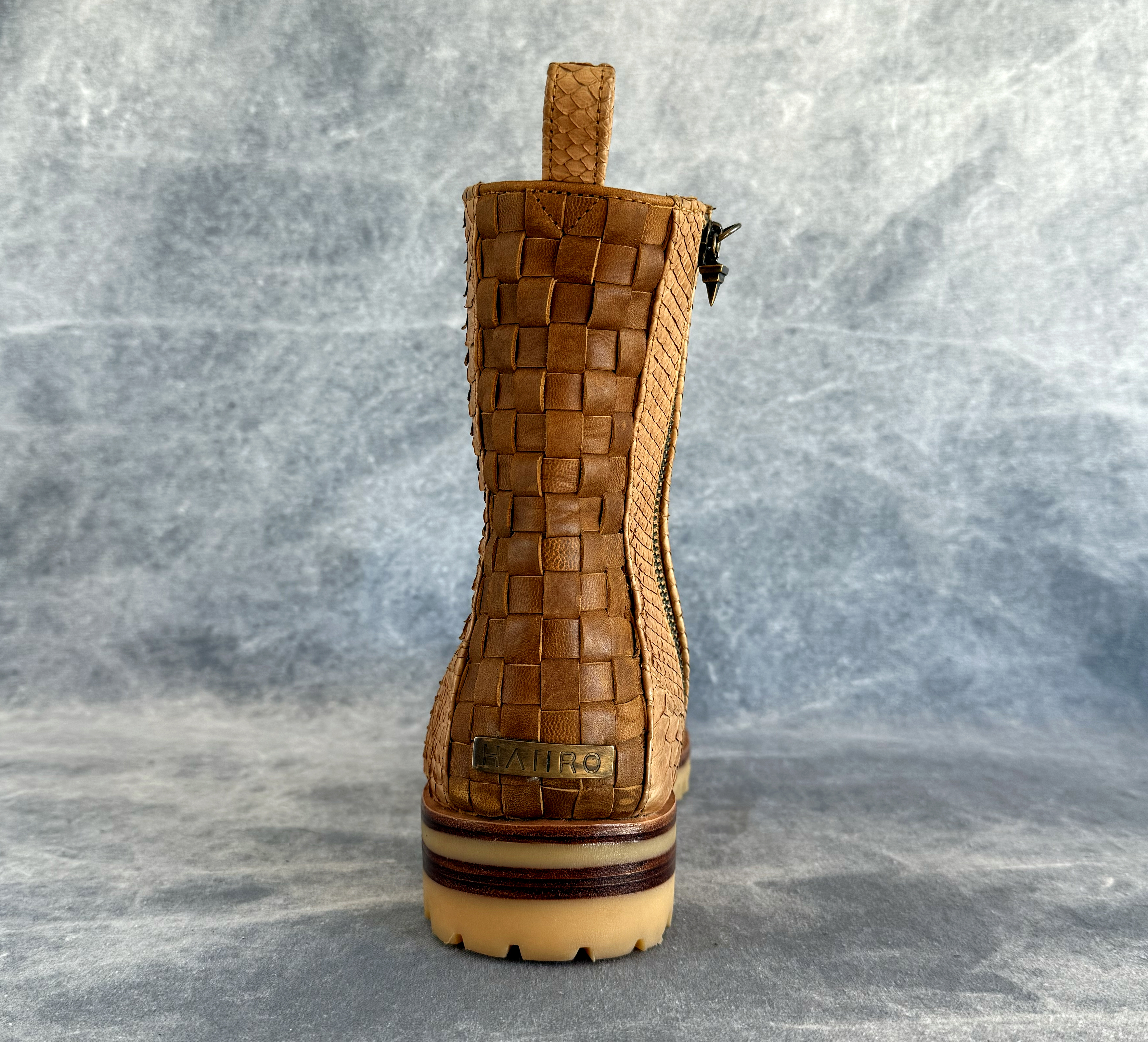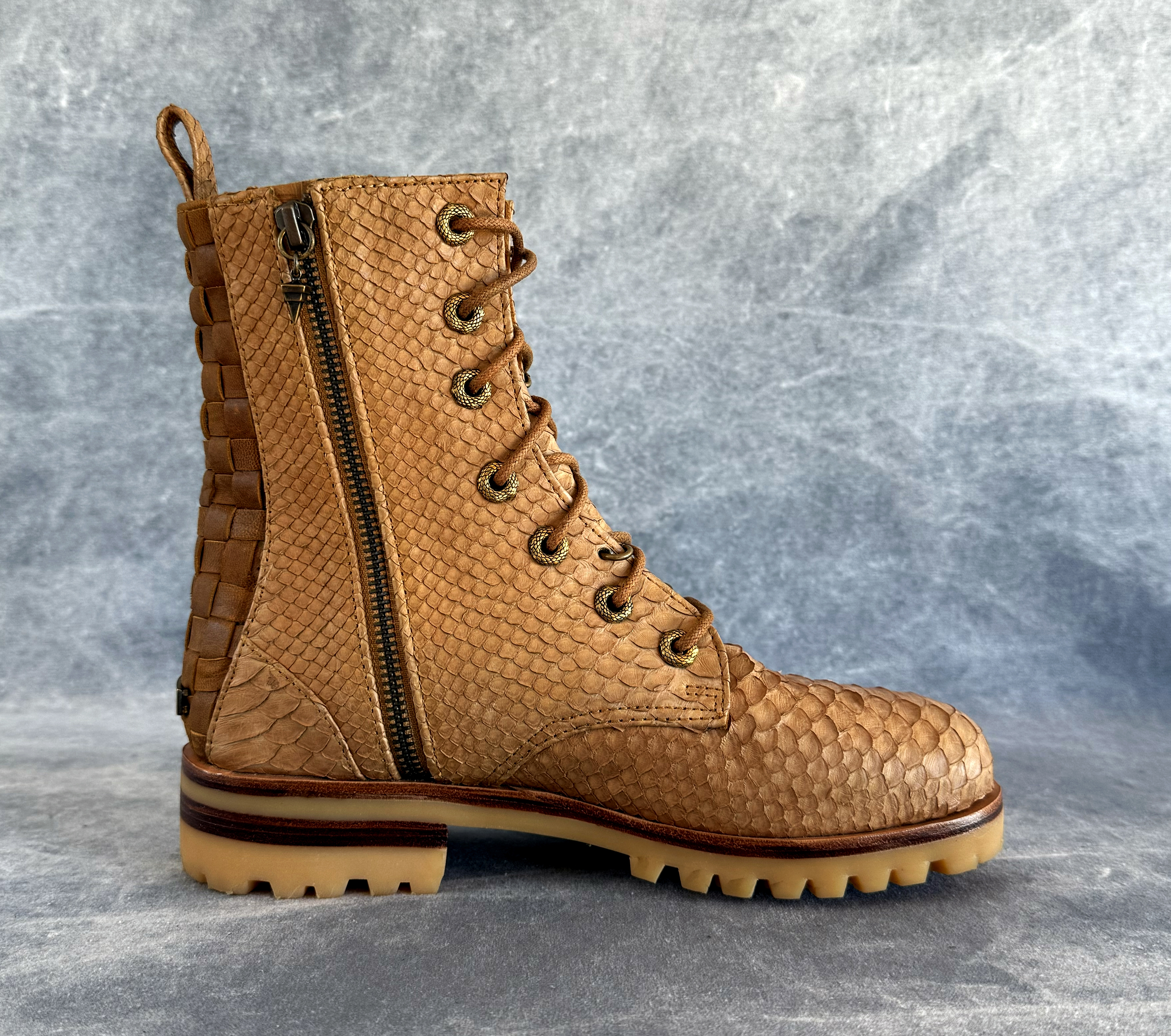 Handmade boots made from a very soft python skin, presenting a rounded toe shape, featuring custom eyelets and a pull tab at the rear. 100% goat leather lining. Leather and rubber outsole with chunky low heel.