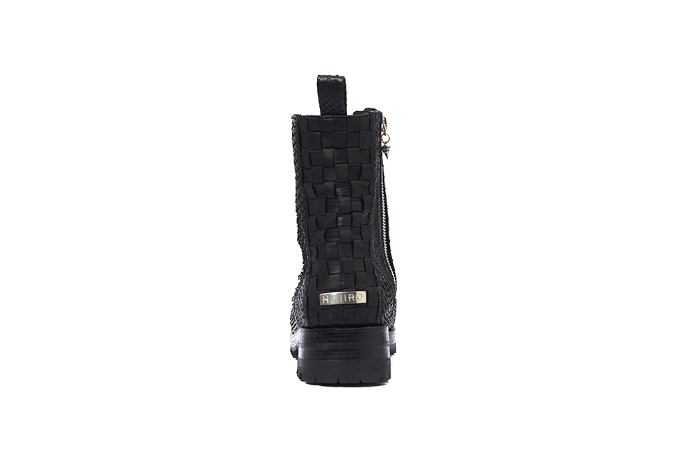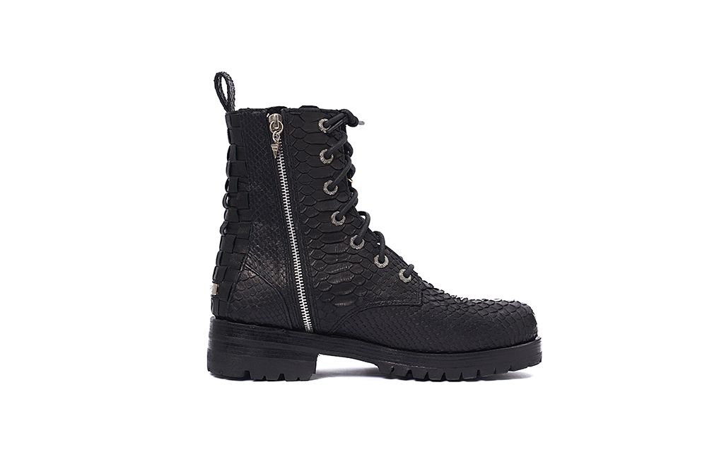 Handmade boots made from a very soft python skin, presenting a rounded toe shape, featuring custom eyelets and a pull tab at the rear.