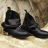 Handmade boots made from cow leather, presenting a rounded toe shape, featuring a detailed leather design in the back with a custom stainless steel heel.